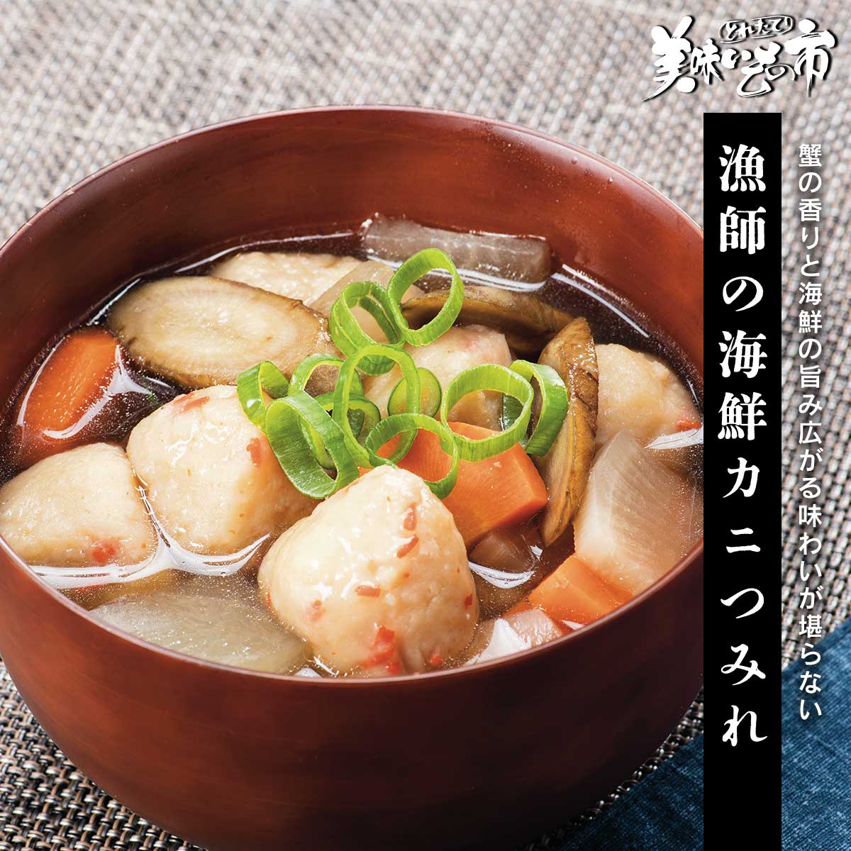 ふんわりとした魚肉のすり身の旨さに、蟹の風味が口内に優しく広がる贅沢な海鮮蟹つみれです。味噌汁で、心にしみわたる美味しさを。大ぶりの具材とともにお鍋やおでんで、心暖まる旨さを。つみれ揚げ、中華あんかけなど様々な料理でも大活躍します。蟹の香りと海鮮の旨み広がる味わいが堪らない ふんわりとした魚肉のすり身の旨さに、蟹の風味が口内に優しく広がる贅沢な海鮮蟹つみれです。味噌汁で、心にしみわたる美味しさを。大ぶりの具材とともにお鍋やおでんで、心暖まる旨さを。つみれ揚げ、中華あんかけなど様々な料理でも大活躍します。 漁師の海鮮カニつみれ 内容量 海鮮漁師カニつみれ 600g(50個)食塩相当量:1.5g/100g 原産地 魚肉(すけそうたら、えそ、太刀魚、他)外国製造、カニペースト 加工地 山口県下関市 賞味保証期間 冷凍120日、解凍後早め アレルギー表示 原材料の一部に、かに・大豆・小麦・卵を含む