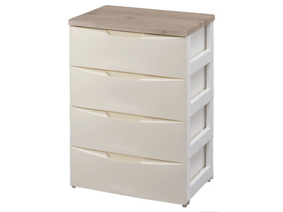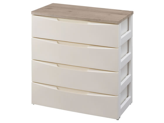 【仕様】光沢を抑え、落ち着きのあるマットな全面パネルと天然木を思わせる木目調の天板です。木目調の天板は大きな木目や節をみせたデザインを採用。天板は耐水加工済なのでランドリーやキッチン等の水回りでもご使用できます。頑丈な天板なので小型テレビなども置くことができます。引出しは開閉がスムーズな金属レールを使用し、たっぷり入れても楽に引き出せます。完成品でもお届けなので、すぐにご使用可能です。●本体サイズ:幅560×奥行420×高さ810mm●色:アイボリー●耐荷重(約):天板10kg、引出1段あたり4kg●引出内寸(約):幅475×奥行360×高さ145mm●収納の目安:Yシャツなら8枚●材質:天板/合成樹脂化粧繊維板(塩化ビニル樹脂・MDF)、前パネル・引出・フレーム・脚/ポリプロピレン、レール/スチール●生産国:日本【備考】※メーカーの都合により、パッケージ・仕様等は予告なく変更になる場合がございます。【検索用キーワード】IRISOHYAMA irisohyama アイリスオオヤマ あいりすおーやま デザインウッドトップチェスト チェスト ちぇすと レギュラータイプ れぎゅらーたいぷ 収納家具 脱衣所用チェスト リビング用チェスト 幅560×奥行420×高さ810mm 1台 4段 アイボリー あいぼりー ivory IVORY スライドレール 衣服収納 収納 耐水加工 ランドリー キッチン 水回り 完成品 木目調 プラスチック製 ぷらすちっく DW−554アイボリー RPUP_03 R59366木目調の天板がおしゃれ!リビングの収納におすすめなウッドトップチェスト。