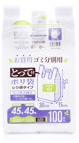 10個セット・ホワイト TR45 LL TR45・・Color:ホワイトSize:TR45 LLStyle:10個セット・本体サイズ:約30×55cm、マチ15cm(1枚あたり)・素材・材質:ポリエチレン・原産国:ベトナム・厚さ:約0.018mm・耐冷温度:マイナス約30度商品紹介 ●乳白色なので中身が見えにくいレジ袋 ●充分な厚みで破けにくいのが特長です。 ●フック穴付きでいろいろな場所でお使い頂けます。 ●エンボス加工で滑りにくく、取り出しやすいので便利です。 ●普段使いはもちろん、業務用にもオススメです。 ●可燃物のため火のそばに置かないでください。 安全警告 この袋は幼児や子供にとって窒息などの危険が伴うものです。幼児や子供の手の届かない所に保管してください。