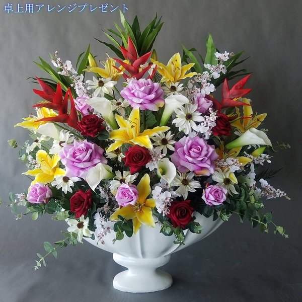 商品について 〇この商品は光触媒コーティングされており、ほこりが付き難く、とても長い間、美しさを保ち続けます。 〇会社応接室、ホテルフロント、大きな居間に最適 〇ホテルフロント、応接室に最適です。 〇とても豪華なサイズのバラのアレンジです。 [使用花材] ・プレミアム Art Flower(造花) ・造花MIXアレンジ ・フアッション花器 [サイズ] 高100cm×巾80cm 注意事項 当店のスタッフによる手作業でアレンジします。 一品一品、多少の個体差が生じます。 モニター環境により多少色合いが異なります。ユリバラMIXアレンジ 高さ120cm×巾100cm 高100×幅80のユリ&バラMIXの明るいアレンジ 光触媒コーティングで空気清浄も行います。 ※プレゼントのシンビジュウム(中央写真) 高35×幅25 黄色のシンビジュウムです、西側に飾って、金運アップです。 メッセージカード、祝札等ご希望の方は、 右下に表示の【この商品についての問合せ】にて、記入指示をしてください。