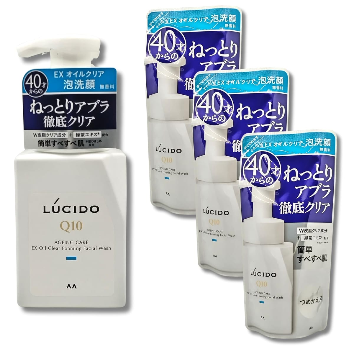 ルシード EXオイルクリア泡洗顔 詰替 本体1本 + 詰め替え3本のセット【アブラを溶解除去】キメ細かな濃密泡で、毛穴の奥からアブラを吸着除去。 W皮脂クリア成分配合で、ねっとりアブラを溶解&洗浄。【肌を整える】肌にハリを与える、Q10配合。 肌のキメを整える、緑茶エキス配合。【その他特徴】シェービングにも使える。 心地よく使える、爽快な使用感。 無香料・無着色・パラベンフリー洗顔後には「ルシード 薬用スキンケアシリーズ」のご使用をおすすめします。 かならず「ルシード EXオイルクリア泡洗顔」の使用済みボトルに1回で全量をつめかえてください。 年齢とともに気になるねっとりアブラ 頑固なベタつきを泡で簡単&速攻洗浄。 ルシード EXオイルクリア泡洗顔。 本体3本と詰替え用のセットです。
