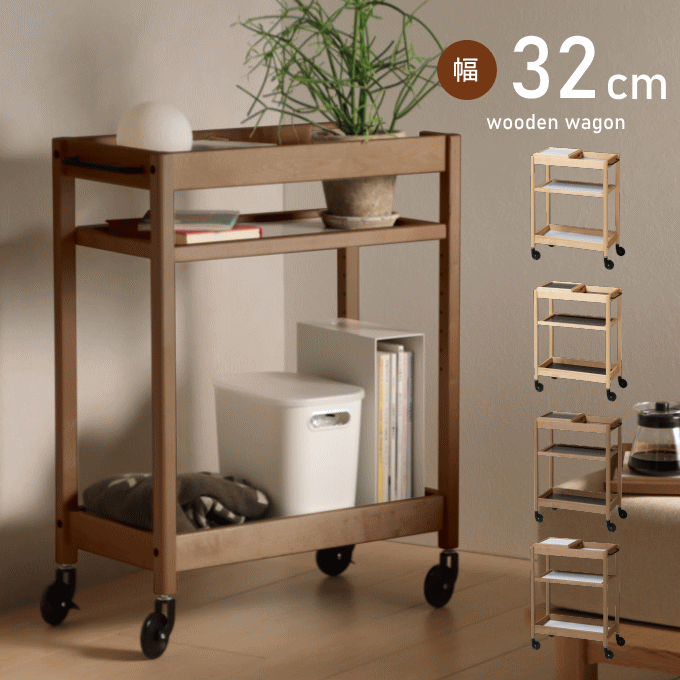Soup スリムワゴン 3段の解説 キャスター付で移動が楽な3段ワゴン。天板は熱に強いタイル仕様となっており、簡易的にお鍋やケトルなどを置くことが出来て機能的。奥行き27.5cmで、すきま収納もできるスリムタイプです。ほかのインテリアにもなじみやすいナチュラル、ホワイトの2色展開です。真ん中の棚板:可動棚(可動棚ピッチ:80mm)棚板は収納するものによって3段階の高さ調節が可能です。棚板裏にはすのこが入っており、強度がUP。棚板には落下防止のため1cmの段差がついております。・可動棚板内寸:幅52.5×奥行56.5cm・底板内寸:幅53×奥行22cm・タイルサイズ:幅52.5×奥行21cm・キャスター付(内2ヶ:ストッパー付き)キャスターは一度取り付けると外すことはできませんキッチンから料理を運ぶのにキャスター付ワゴンがあれば、ダイニングへの移動も楽々!コンパクトタイプのトースターや炊飯器を置くことも可能。一人暮らしのキッチン収納にぴったりです。側面には市販のフックを取り付けてティッシュケースや鍋つかみを収納したり、用途に合わせてアレンジが可能です。天板には熱に強いタイルがはめ込まれております。簡易的に、熱いお鍋やケトルを置いたりするのに便利で調理がはかどります。汚れた際もサッと拭き取るだけなのでお手入れも簡単です。スノコ状の底板はペットボトルも安全に置くことができます。 Soup スリムワゴン 3段の詳細 品番 W-3347 サイズ (約)幅59×奥行27.5×高さ72cm 梱包サイズ (約)72×30.5×21cm 重量 (約)6.3kg 梱包重量 (約)7.2kg 材質 天然木(ラバーウッド材)、タイル 塗料 ラッカー塗装 耐荷重 天板:(約)5kg、棚板:(約)2kg、底板:(約)5kg 生産国 ベトナム 組立 組立品(組立時間約30分)Soup ワゴン ラインナップ キッチンワゴン スリム キッチンワゴン ワイド ワゴン 3段 ワゴン 4段
