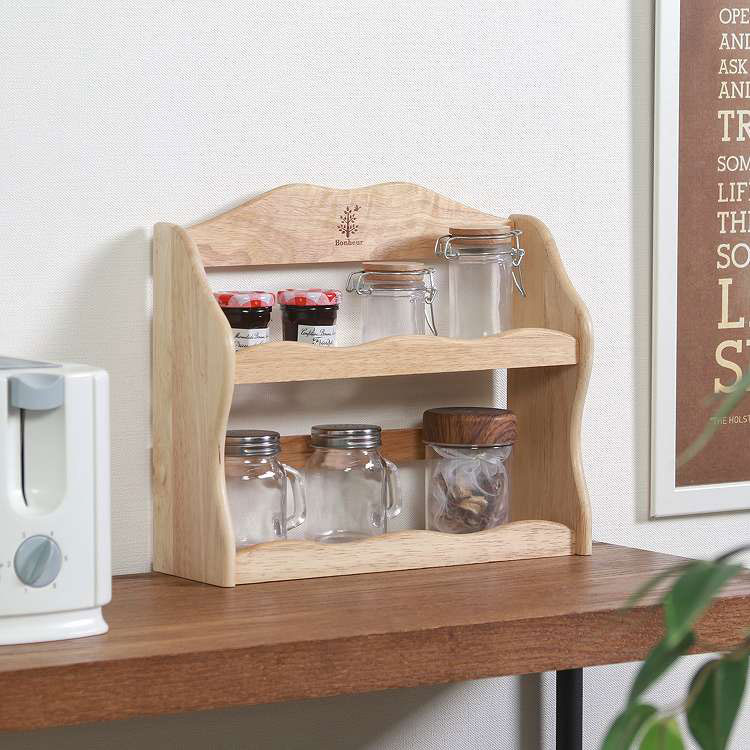 ■商品サイズ幅30×奥行9.5×高さ26cm■素材天然木(ラバーウッド)[ラッカー塗装]■生産国ベトナム■特徴2段でたっぷり収納!木製スパイスラックワンポイントのマークがかわいいシンプルなデザインで、キッチンに自然と馴染みます。幅30×奥行9.5cmの2段タイプで、塩やコショウなどよく使う調味料をまとめて収納できます。取り出しやすいオープンタイプ。調味料が倒れないようにストッパーが付いています。コンロ脇にも置きやすい、奥行9.5cmのスリムサイズです。リビングや玄関の小さな観葉植物や小物置きとしてもお使いいただけます。優しく穏やかな木目、滑らかな触り心地のラバーウッドを使用。天然木の温もりを感じられるキッチンツールです。■備考完成品【代引きについて】こちらの商品は、代引きでの出荷は受け付けておりません。【送料について】北海道、沖縄、離島は送料を頂きます。