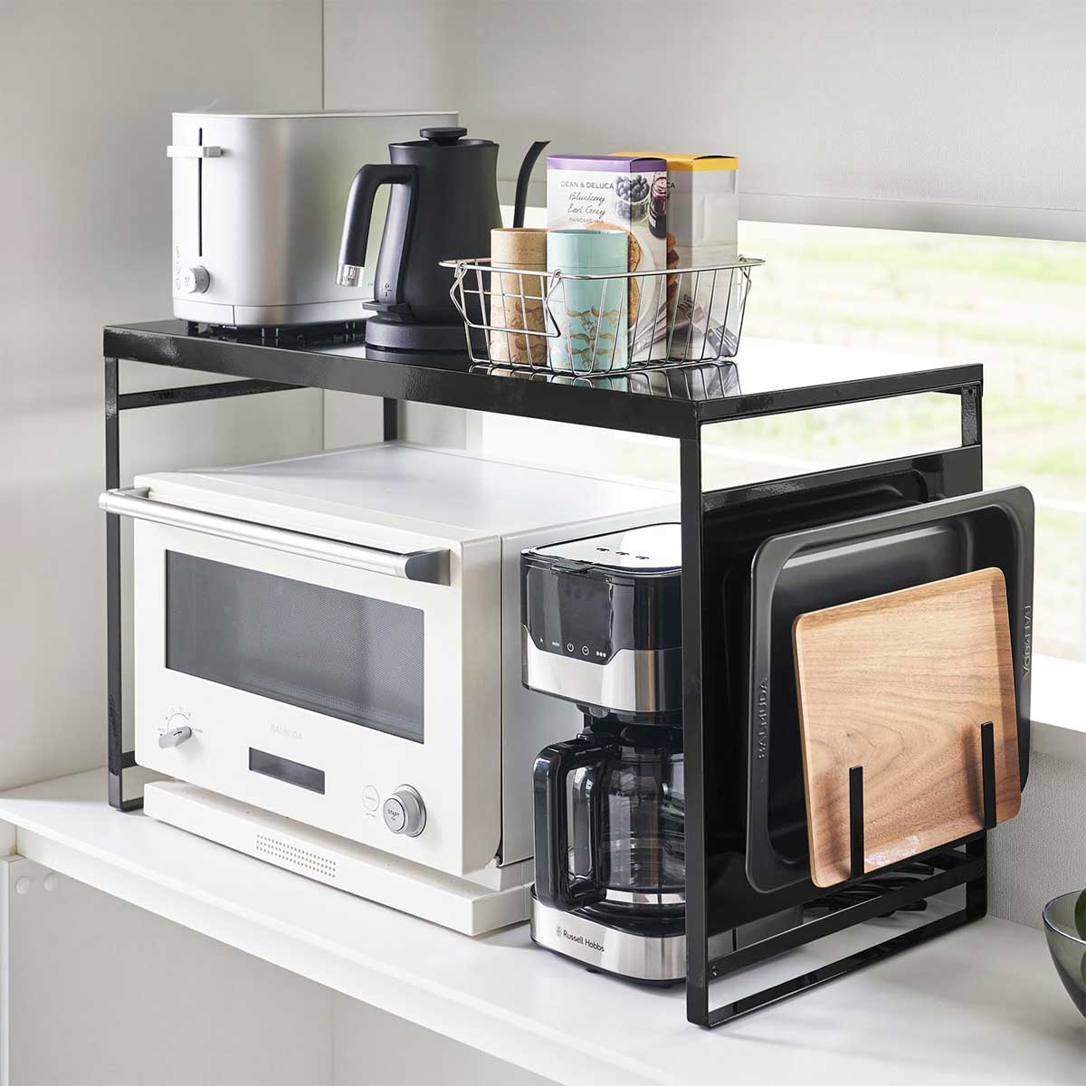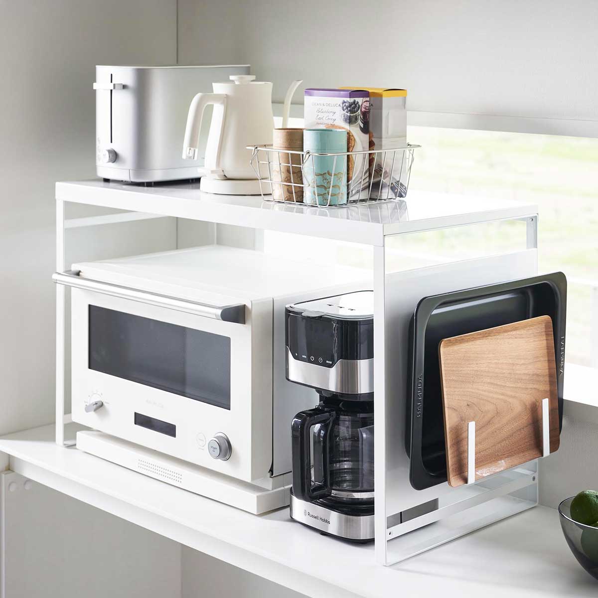 キッチン側は扉なしで使いやすい リビングからはスッキリ隠せて、キッチンからは使い勝手の良さが嬉しい奥行き24cmのカウンター上収納ラックです。リビングからはスッキリ隠せて、キッチンからは使い勝手の良さが嬉しい。スチール製なのでマグネットがつき便利です。 天板にはトースターなどの家電も リビング側は全面が開くフラップ式の扉なので、中の物も取り出しやすいです。キッチン側は扉がないのでサッと物の出し入れがしやすいです。壁際に設置すればブレッドケースとしても使用でき、天板にはトースターを設置することができます。 商品の情報 ・ブランド:YAMAZAKI(山崎実業)/日本 ・ジャンル:カウンター上収納 ・主な素材:スチール 粉体塗装(本体)/POM樹脂(ローラー部)/ポリプロピレン(レール部)/シリコーン(クッション) ・生産国:中国 ・サイズ:約W600xD267xH252mm(扉を閉じた状態)/約W600xD310xH265mm(扉を開けた状態) ・内寸サイズ:約W597xD237xH10mm(天板)/約W597xD235xH210mm(収納部有効内寸 ※ローラー部含まず) ・重量:約5750g ・耐荷重:天板5kg、収納部5kg(静止荷重) この商品の仲間たち tower タワー 前が開くキッチンカウンター上収納ラック D24 1454 ホワイト tower タワー 前が開くキッチンカウンター上収納ラック D24 1455 ブラック