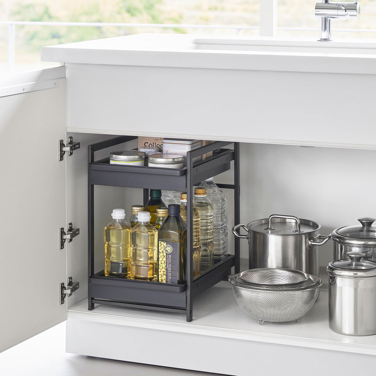 使いやすいスライド式収納! シンク下のスペースを有効活用できる収納ラックです。奥行と高さがあって収納が難しいシンク下を無駄なく活用できるスライド式収納ラック2段です。洗面台下への設置もおすすめ。 洗面台下の設置もおすすめ! 引き出しはハンドル付きで引き出しやすく、スライド式なので奥の収納物もスムーズに出し入れが可能。引き出し上段は収納する物に合わせて、5cm刻みで高さが4段階調節できます。 商品の情報 ・ブランド:YAMAZAKI(山崎実業)/日本 ・ジャンル:収納ラック ・主な素材:スチール ユニクロメッキ 粉体塗装 ・生産国:中国 ・サイズ:約W304xD424-685xH453mm ・内寸サイズ:約W246xD393xH59mm(引き出し上段、下段) ・重量:約6050g ・耐荷重:引き出し上段5kg/下段10kg(静止荷重) ・付属品:六角レンチ ・その他:お客様組立て品となります。 この商品の仲間たち tower タワー シンク下スライドラック 2段 1460 ホワイト tower タワー シンク下スライドラック 2段 1461 ブラック