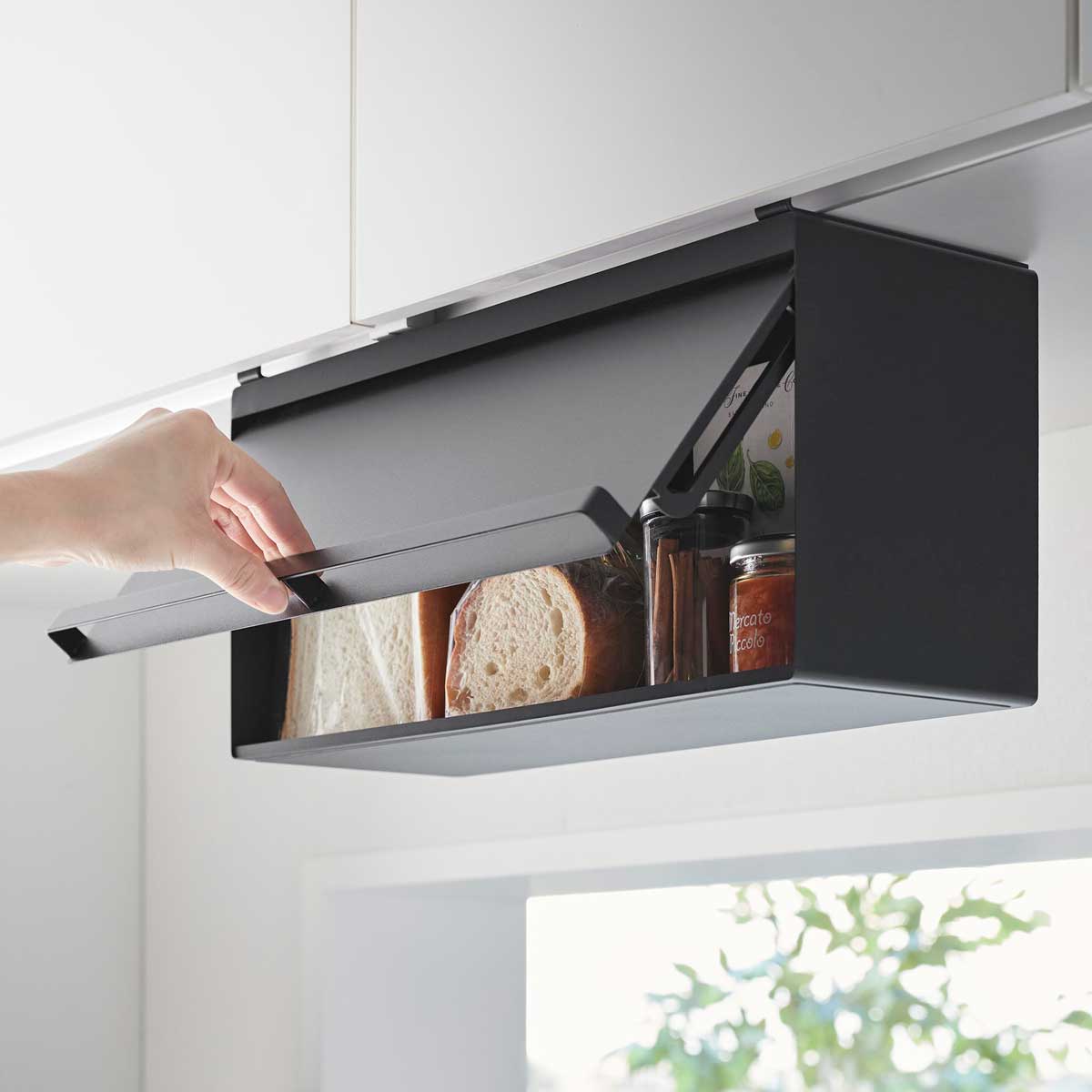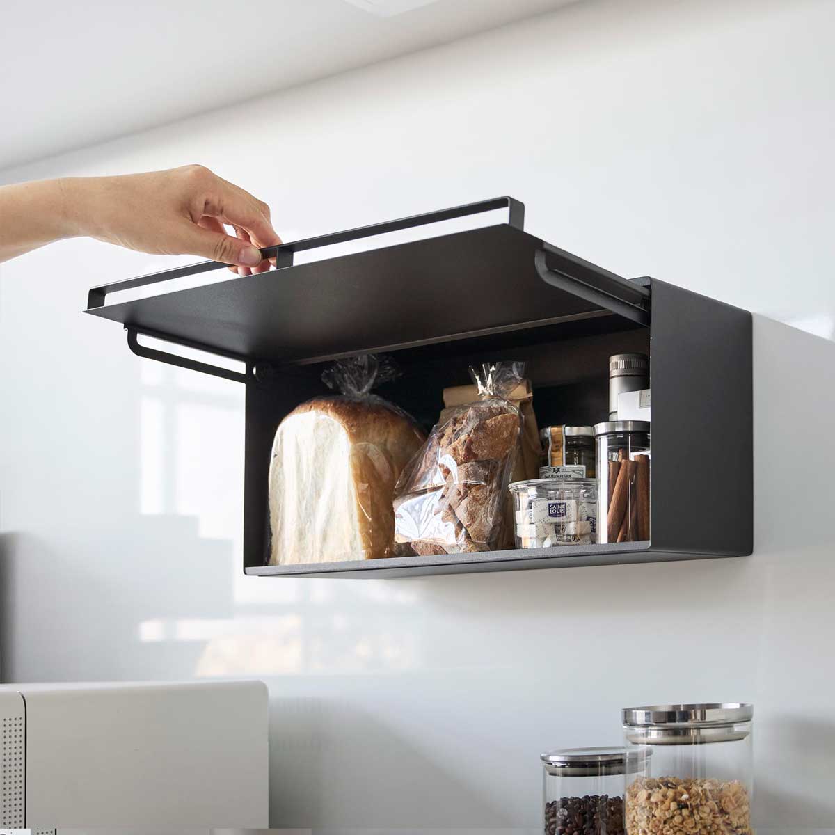 戸棚下に浮かせて収納 キッチンの吊り戸棚に差し込むだけで簡単に設置できる、スチール製のブレッドケースです。パンや調味料をすっきり収納でき、キッチン周りを広く使えます。扉を開けるときは持ち上げてから押し込む構造です。 商品の情報 ・ブランド:YAMAZAKI(山崎実業)/日本 ・ジャンル:ブレッドケース ・主な素材:スチール 粉体塗装/POM樹脂(ローラー部)/シリコーンゴム(緩衝材) ・生産国:中国 ・サイズ:約W420xD170xH228mm/約D189mm(扉開口時) ・内寸サイズ:約W418xD146xH175mm(収納部有効内寸 ローラー部含まず) ・重量:約2540g ・耐荷重:4kg(静止荷重) ・取り付け可能な吊り戸棚:棚板の厚さ14-20mm、棚板の幅420mm以上、棚板の奥行き150mm以上、扉と棚板との隙間3.5mm以上が必要です。 ※設置場所のサイズや厚さ、形状、材質によっては設置できない場合があります。なお、ガラス戸へのご使用はお避け下さい。 この商品の仲間たち tower タワー 戸棚下ブレッドケース 10256 ホワイト tower タワー 戸棚下ブレッドケース 10257 ブラック