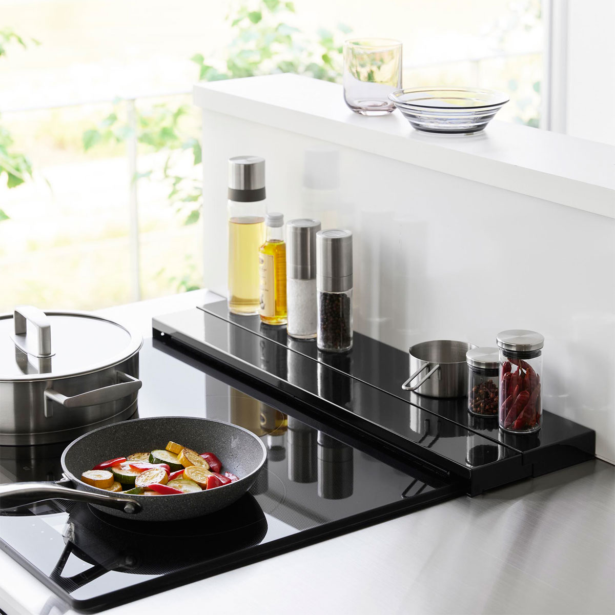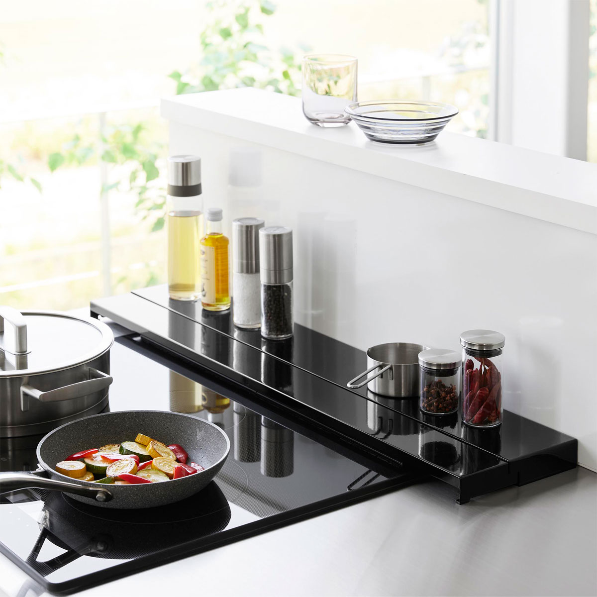 油はねや汚れからコンロ周りを守ります! 奥行きが伸縮するのでコンロ奥の壁から排気口まで、隙間なく汚れを防止できる奥行伸縮排気口カバーです。排気口や壁の隙間に飛び散る油はねうあ調理くずなどの汚れを防止します。 奥行きが伸びるので隙間もガード! 調味料などの小物だけでなく大きめの鍋やフライパンなどの一時置きにも便利。調味料などの小物であれば、奥に置いたまま伸縮できます。グリル使用時には奥にスライドさせるだけ。 商品の情報 ・ブランド:YAMAZAKI(山崎実業)/日本 ・ジャンル:排気口カバー ・主な素材:スチール 粉体塗装/シリコーン(滑り止め) ・生産国:中国 ・サイズ:約W640xD100〜165xH37mm ・重量:約1400g ・耐荷重:約10kg/約3kg(伸縮時カバー上) ・耐熱温度:約200℃ ・対応サイズ:幅約61cm以内のビルトインガスコンロ、IHクッキングヒーター/高さ約2.1cm以内の排気口 ・その他:分解して水洗いできるので清潔に保てます。 この商品の仲間たち 正規品 tower タワー 奥行伸縮排気口カバー 60cmコンロ用 ホワイト 正規品 tower タワー 奥行伸縮排気口カバー 60cmコンロ用 ブラック