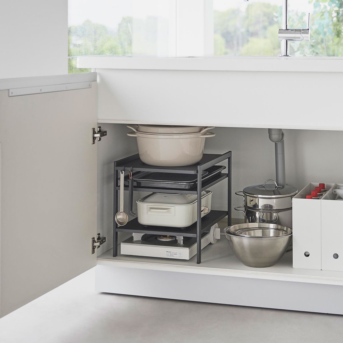 シンク下を有効活用で収納力アップ! コンパクトで頑丈なスチール製キッチンラック。約10kgの耐荷重でホットプレートや鍋、オーブン用トレーなどをスッキリ収納。約2.5cm刻みの細かい高さ調節が可能で、無駄なく使えるのが魅力。ハンドル付きの棚板にはフック取り付け可能で、キッチン小物もスッキリ片付きます。 省スペースで使える多機能ラック! ホットプレートやカセットコンロの収納にも最適な多機能ラック。各棚の耐荷重は約10kgで、重い鍋も安心して収納可能。細かな高さの調節ができ、オーブンのトレーからキッチン小物まで幅広いアイテムの収納が可能。キッチンをスッキリ整頓して快適な空間を実現します。 商品の情報 ・ブランド:YAMAZAKI(山崎実業)/日本 ・ジャンル:キッチンラック ・主な素材:スチール 粉体塗装(本体)/ポリプロピレン(キャップ) ・生産国:中国 ・サイズ:約W330xD415xH345mm(本体)/約W310xD400mm(ハンドル付き棚板、棚板) ・重量:約4600g ・耐荷重:約10kg(各棚)/約250g(フック1つあたり) ・内容物:本体/フック x3/六角レンチ ・その他:お客様組立て品となります。 この商品の仲間たち 正規品 tower タワー 高さ調節シンク下ラック 3段 ホワイト 正規品 tower タワー 高さ調節シンク下ラック 3段 ブラック