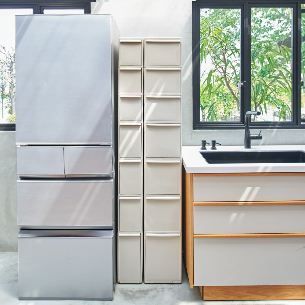 トレンドのニュアンスカラーをキッチン収納にも♪●「スタイリッシュな家電を揃えても、収納用品が無粋で興ざめ」「インテリアになじむ素敵なデザインが見当たらない」とお嘆きの方におすすめのおしゃれなすき間収納です。●(ア)ホワイト(イ)ベージュ(ウ)グレーから、キッチンの雰囲気に合わせてお好きな色が選べます。●どの色も今の時代のトーンに合ったセレクト。少しくすみを加味したきれいめカラーで、チープな印象を与えません。●引き出し内の収納物が透けて見えないから、生活感もしっかり隠せます。●汚れがサッと拭き取れるポリプロピレン素材でお手入れも簡単。きれいな姿を長くキープします。幅も高さも選べて「欲しかったサイズ」が手に入る●幅は14cm・17cm・25.5cmからすき間に合わせて選べます。●高さは82cmと170.7cmをご用意。奥行は全タイプ46.5cm(取っ手含む)です。●高さ82cmはシンク横に置いて作業の延長スペースにも。天板上にちょい置きもできて便利です。●高さ170.7cmは収納力たっぷり。計7杯の引き出しに調味料から食品ストックまで、さまざまな物が整理できます。●このページでご購入できるのは「幅17cm・高さ170.7cmタイプ」です。引き出しの深さに合わせた効率収納が叶う!●引き出しの深さが各段で容量が違うので、収納物のサイズに合わせて細かく仕分けられます。・1〜3段目はSサイズの引き出し。袋入りラーメンやレトルト食品、缶詰などを入れやすい内寸高16.2cm。・4〜6段目はMサイズの引き出し。500ミリリットルのボトルやカセットボンベがスポッと収まる内寸高22.6cm。・最下段はLサイズの引き出し。2リットルのボトルが入る内寸高31cm。●引き出しにはストッパー付きで、抜け落ちの危険を防ぎます。●底面にはちょっと動かしたい時に便利なキャスター付き。●キッチンだけなく、洗面所やダイニングにも置けるルックスが自慢。家中あらゆるところで活躍します。●組立不要の完成品。お客さまにて上段・下段のジョイントのみお願い致します。●丈夫で丁寧なつくりの日本製です。シリーズ商品のご案内インテリアに調和する多段スリム収納は以下のシリーズ商品がございます。・ロータイプ・3段 高さ82cm 幅14cm・ハイタイプ・7段 高さ170.7cm 幅14cm・ロータイプ・3段 高さ82cm 幅17cm・ハイタイプ・7段 高さ170.7cm 幅17cm・ロータイプ・3段 高さ82cm 幅25.5cm・ハイタイプ・7段 高さ170.7cm 幅 25.5cmページ下部に画像の説明がございます。一部別売りの商品もございますので、説明文ご確認のうえご注文ください。>画像の説明はこちら<仕様・サイズこの商品はセール品のため返品できません■色:(ア)ホワイト (イ)ベージュ (ウ)グレー■サイズ:幅17cm奥行46.5cm(取っ手含む)高さ170.7cm・重さ約11kg■引き出し奥行内寸43.5cm(最下段は40.5cm)■素材:本体…ポリプロピレン■転倒防止バンド付き■お客さまにて上下ジョイント■日本製【取り付け時間約20分】【送料マーク:B】 この商品の配送料は2500円(税込)です。※沖縄県へのお届けは上記に地域特別配送料2200円(税込)が追加されます。この商品は下記のサービスが選択できます。※組み立て・開梱サービスは日時指定ができません。お届け前に配送所より配達日時のご連絡をさせていただきます。※別途配送料金がかかります。有料組み立てサービス※開梱サービス付きについて 画像の説明コーディネート例(イ)ベージュ 今どきインテリアになじむおしゃれな色合いのストッカー。 ※お届けは写真左のハイタイプ高さ180cm幅17cmです。写真の引き出しは別売りの幅25.5cmタイプ(イ)ベージュです。お届けする商品は幅17cmタイプになります。引き出しの内寸高さは共通です。1〜3段目の引き出しは、乾麺やスパイスなどが入る高さ設計です。 ※写真の引き出しは別売りの幅25.5cmタイプ(イ)ベージュです。お届けする商品は幅17cmタイプになります。2〜4段目の引き出しは、インスタント食品などが入る高さ設計です。 ※写真の引き出しは別売りの幅25.5cmタイプ(イ)ベージュです。お届けする商品は幅17cmタイプになります。(ア)ホワイト お届けする商品です。 ※引き出しSサイズ×3、Mサイズ×3、Lサイズ×1(イ)ベージュ お届けする商品です。 ※引き出しSサイズ×3、Mサイズ×3、Lサイズ×1(ウ)グレー お届けする商品です。 ※引き出しSサイズ×3、Mサイズ×3、Lサイズ×1汚れがサッと拭き取れて、お手入れが簡単です。引き出しには抜け落ち防止のストッパー付き。前後に動くキャスター付きなので移動も簡単。使用イメージ(ウ)グレー わずかなすき間に大量収納できるハイタイプ。 ※写真は別売りのハイタイプ高さ180cm幅14cmです。使用イメージ(ア)ホワイト ロータイプは天板上に物が置け、洗面所にも! ※写真は別売りのロータイプ高さ90cm幅17cmです。