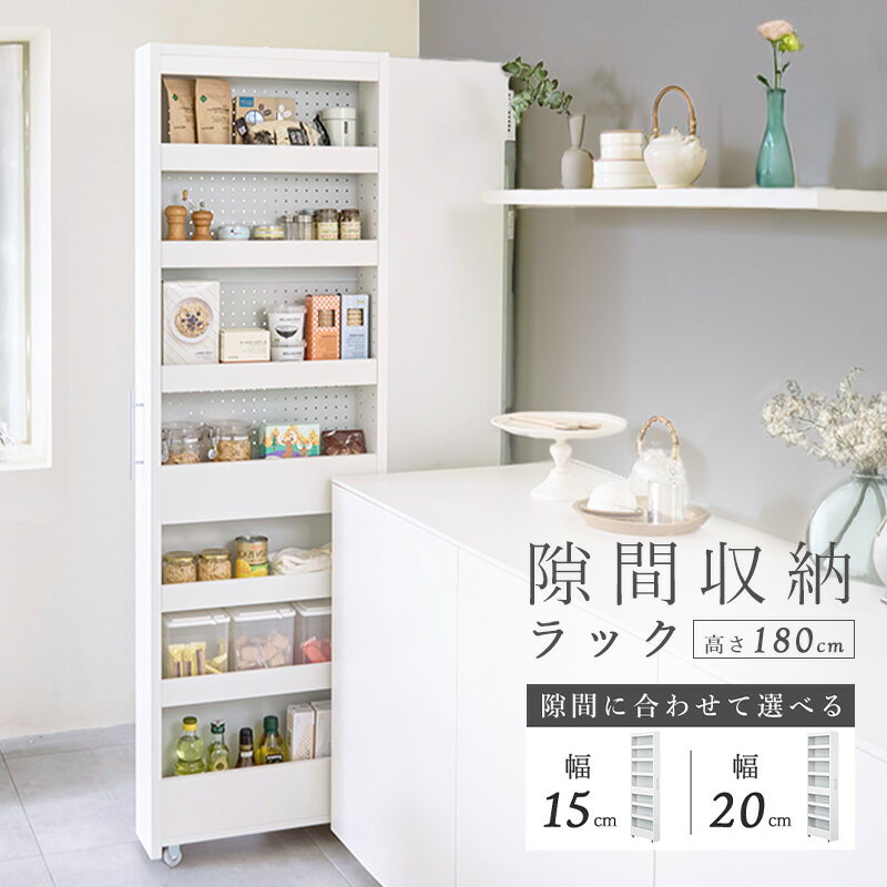 キッチンの隙間を有効活用! 隙間収納ストッカー【選べる2サイズ:幅15cm/幅20cm】 おすすめポイント: ・高さ180.1cmで省スペースながら大容量収納可能なスリムデザイン。 ・幅は15cmまたは20cmから選べ、奥行は55.0cmで冷蔵庫横などの狭い隙間にぴったり収まります。 ・本体はホワイトを基調とし、背板はグレーのプリント紙化粧繊維板を使用。シンプルで清潔感のある見た目です。 ・棚板は5枚の可動棚で、高さは3cmピッチで調節可能(棚板厚み18mm、ピッチ30mm)。ストッパー付きで棚のずれ落ちを防止します。 ・背面は有孔ボード(ペグボード)仕様で、フックを使った引っ掛け収納が可能。キッチングッズや小物を掛けて省スペース収納ができます。 ・底板は耐荷重10kgで2Lペットボトル5本収納可能。キャスター付きで出し入れがスムーズに行えます。 ・取っ手は約3.0cm幅のシルバーで、スタイリッシュな見た目。取り外し可能で左右どちらの向きにも設置可能です。 ・転倒防止補助ベルト付きで地震や災害時の転倒リスクを軽減。 ・キャスターはナイロン製の4個付きで軽い力で移動可能。 ・お客様組立品です。 利用場所:キッチン リビング 冷蔵庫横 狭い隙間収納 食品ストック整理 利用人数:一人暮らし ファミリー向けキッチンの隙間を有効活用!【選べる2サイズ:幅15cm/幅20cm】 商品名 キッチンの隙間を有効活用!【選べる2サイズ:幅15cm/幅20cm】 色 ホワイト(背板グレー) おすすめポイント 高さを抑えたスリムデザインで、省スペースながら大容量収納が可能な隙間収納ストッカー。 狭い隙間を有効活用し、キッチンやリビングの整理整頓に最適です。 シンプルでベーシックなフォルムはどんなインテリアにも馴染みやすく、清潔感のあるホワイトカラーを基調としています。 キャスター付きで移動も簡単、使いたい場所にサッと動かせるのもポイントです。 サイズ 幅15cmまたは20cm × 奥行55.0cm × 高さ180.1cm 商品重量 幅15cm:約 25.1kg 幅20cm:約 28.3kg 材質 プリント紙化粧繊維板(本体)、亜鉛合金(取っ手・フック)、ナイロン(キャスター)、スチール・ポリプロピレン(補助ベルト) 仕様 ・耐荷重:中棚5kg、移動棚5kg、地板10kg、有孔ボード3kg ・梱包サイズ:幅184.1 × 奥行43.4 × 高さ10.2cm ・白を基調としたシンプルで清潔感のあるデザイン ・ペグボードタイプの背面 ・移動に便利なキャスター付(キャスター4個) ・棚板厚み18mm、ピッチ30mmでしっかり頑丈 ・背面化粧有 ・転倒防止補助ベルト付 ・お客様組立品 ※組み立ては2人以上で行ってください 配送について 玄関先お届け 沖縄県全域/離島への配送は別途送料が必要です(※送料は当店へご確認ください) 注意事項 ・本体の移動時は転倒に注意して下さい。 ・平らで硬い床面(フローリングなど)での使用推奨。 ・必ず、壁や安定感がある家電、家具で挟まれた隙間に設置し、隙間幅の目安は約19〜24cm。 ・乱暴な出し入れは避けてください。 ・引き出す際は隙間に10cm以上の本体残しが必要です。 ・高い位置に不安定な物を置かないでください。 キッチン収納一覧はこちら トップページへ
