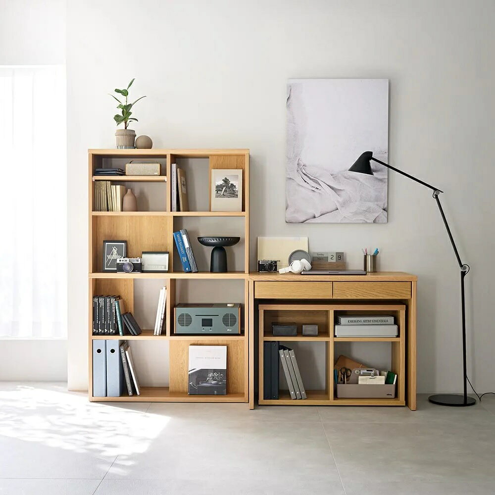 「普段はデスクに見えない」新発想。別売りのデスクと合わせることで、使い勝手の幅が広がります。シェルフ単体でもディスプレイ収納としてリビングでも書斎でも置き場を選ばないスタイルです。ONとOFFの切り替えができる新しいデスクシリーズOFFタイムはまるで棚のようにコンパクトに収納できる、シェルフが登場しました。リモートワークやリビング学習にも最適です。ONタイムは別売りのデスクと置けば、サイドラックのように使うこともできます。シーンに合わせてスタイルチェンジ別売りの平デスク、オープンワゴンを組み合わせることで書斎だけはなく、リビングにも対応したスタイルを作ることができます。おすすめの3つのSTYLEをご紹介します。STYLE01 リビングに作るまるでディスプレイ収納のようなワークデスクシェルフとデスクを横並びに設置して、オープンワゴンをデスク下に収納すれば、まるでディスプレイ型の見せる収納として、リビングやダイニング裏に設置ができます。使うときだけオープンワゴンを移動して、ダイニングチェアなどを使ってワークスペースに変身。場所を取らないスタイルとしておすすめです。STYLE02 作業しやすい奥行が広いワークデスク書斎として使うのに便利な奥行が深いデスクスタイル。シェルフの中段の棚とデスクの高さが揃うので、使い勝手も広がります。STYLE03 ものが取り出しやすいデスクサイドラックデスクの横に向きを替えて設置すれば、シェルフをデスクサイドラックとしても使用できます。横に設置することで間仕切りのように使うことも。デスク2台の間にシェルフを挟めば2名分のワークスペースを確保することも。シェルフの機能について背板のある部分と無い部分があるので、ディスプレイ収納のとして、おしゃれに飾ることも可能。デスクを挟んでシェルフを設置すれば、オープン部はどちらからも収納物を取り出すことができます。中段の棚はデスクと高さが揃うので、シェルフを奥に設置したり、デスクサイドラックのように横に設置することで使い勝手の幅が広がります。ページ下部に画像の説明がございます。一部別売りの商品もございますので、説明文ご確認のうえご注文ください。>画像の説明はこちら<仕様・サイズ■色:(ア)ウォルナット (イ)オーク■サイズ:幅90cm奥行29.6cm高さ141.2cm■素材:本体…ウォルナット/オーク天然木化粧合板(ウレタン塗装)、側面…化粧合板■天板耐荷重約20kg■可動棚板1枚付き■日本製【送料マーク:D】 梱包サイズが大きいため、お部屋まで搬入できない場合があります。ご注文の際は、必ず事前に梱包サイズと設置場所までの搬入導線(通路の幅・高さ等)をご確認ください。>詳細な説明はこちら<この商品の配送料は5000円(税込)です。※北海道・九州・沖縄は地域特別配送料がかかります。この商品は下記のサービスが選択できます。※組み立て・開梱サービスは日時指定ができません。お届け前に配送所より配達日時のご連絡をさせていただきます。※別途配送料金がかかります。有料開梱サービスについて 画像の説明コーディネート例(イ)オーク ※お届けは左の幅90cmシェルフのみです。右はデスク幅90cmとオープンワゴンになります。(イ)オーク ※お届けは幅90cmシェルフのみです。(ア)ウォルナットシェルフ+別売りデスク+別売りオープンワゴンシェルフ+別売りデスク+別売りオープンワゴンシェルフ+別売りデスク+別売りオープンワゴン脚部裏(イ)オークコーディネート例(イ)オークコーディネート例(イ)オークコーディネート例(ア)ウォルナット