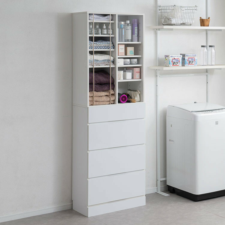 ■サイズ・色違い・関連商品■約幅45cm[当ページ]■約幅60cm■商品内容◎奥行20cmの薄型タイプだから、狭いスペースにも設置OK◎高さ調整できる可動棚付のオープン棚+3段のフラップ扉棚で大量収納!◎オープン棚は可動棚付なので、収納したいものに合わせて高さを5段階調整できます◎フラップ棚はタオルや衣類の収納におすすめ収納目安(幅45/フラップ1段): フェイスタオル約10枚、衣類約7枚収納目安(幅60/フラップ1段): フェイスタオル約14枚、衣類約9枚◎フラップ扉棚の下にも収納スペースあり体重計などを隠して収納。ロボット掃除機も潜れます。◎擦り傷、汚れ、水に強い素材水に強いPVC加工の前板を使用。塩化ビニール樹脂で耐久性や防水性を向上。<選べるタイプ>・約幅45cm・約幅60cm※画像はご覧のモニターやパソコン等により実際と多少色合いが異なって見える場合がございます。■商品スペック■品質/天板・前板:合成樹脂化粧繊維板(塩化ビニール樹脂)、その他:プリント紙化粧繊維板■サイズ(幅×奥行×高さ/約cm)幅45cm:45×20×137.5■内寸(幅×奥行×高さ/約cm)フラップ扉棚(1段あたり):38.3×13.5×24.4(側板12.6)、オープン棚:41.5×19.8×46■重量(約kg)/17.6■組立時間(約)/60分 ※大人2人で組立作業にかかる時間の目安です。【ご注意事項】・本品はお客様にて組立ての作業が必要となります。・商品の組立て開始前に、部材不足・破損がないか必ずご確認ください。【在庫状況・キャンセルについて】複数販路で販売しているため、在庫調整の都合上ご購入後にキャンセルになる場合がございます。また、複数個のご注文は承ることができない場合がございます。予めご了承くださいますようお願いします。■送料・配送についての注意事項●本商品の出荷目安は【2 - 7営業日 ※土日・祝除く】となります。●お取り寄せ商品のため、稀にご注文入れ違い等により欠品・遅延となる場合がございます。●本商品は仕入元より配送となるため、沖縄・離島への配送はできません。