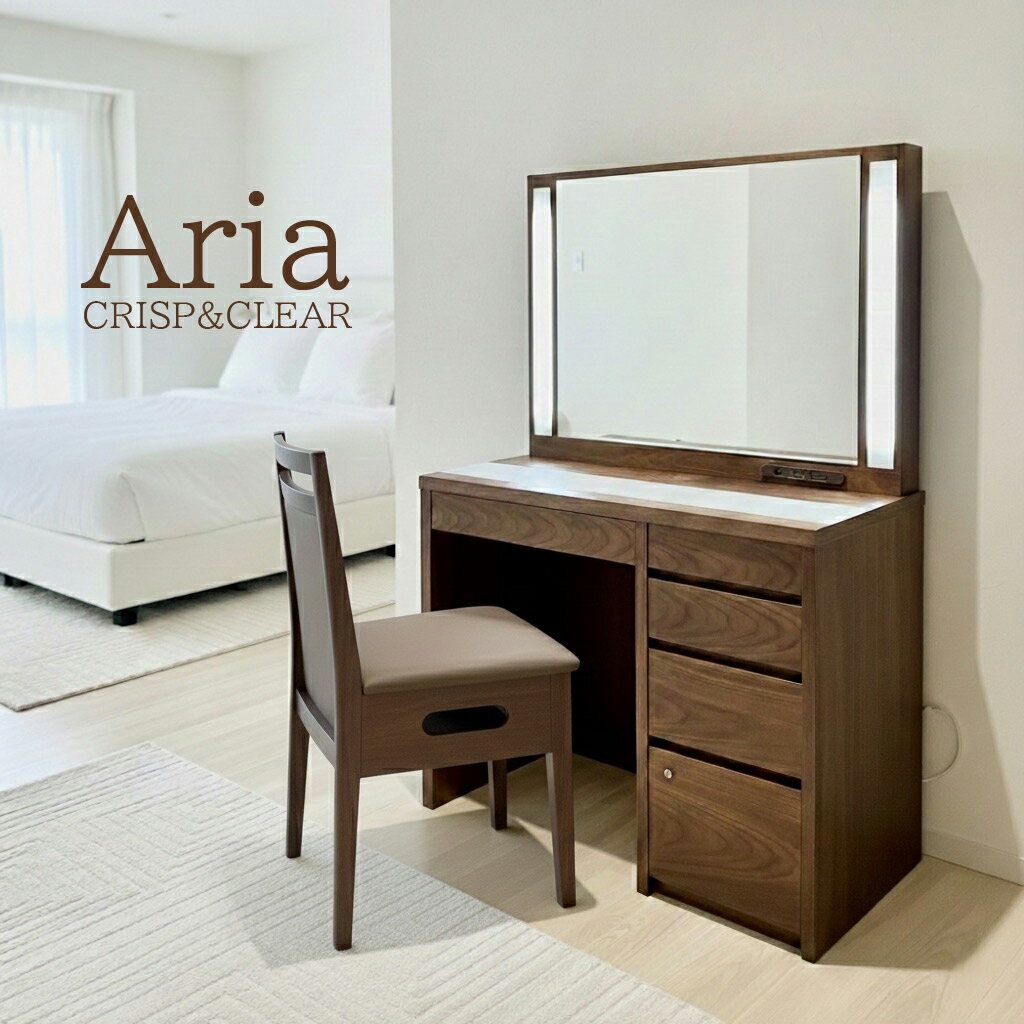 大きな鏡が特徴の、リゾートホテルLEDドレッサーの「アリア」です。 ●アリアリゾートホテルドレッサー(本体カラー5色) ●サイズ:幅90cm :総高さ138cm:奥行き41cm ●本体仕様:シルバーハート無垢板:MDF:シルバーハート突板:ウレタン塗装仕上 ●国産:静岡市 ●椅子付き ●椅子の仕様:ブナ材/ウレタン塗装仕上 ●椅子座面:ファブリック/ポリエステル素材付 ●属品:ライト:ジュエリーケース ●長さのあるボトルがスッキリおさまり、鏡のウラ収納が楽な仕組みです ●メイクに必要なすべてが収まる秀逸な収納スペースはストック置きにも十分な容量です。 ●送料無料開梱設置:本体・鏡・椅子の2梱包でお届けします。お部屋で配達員が鏡を本体に取付けして完成します。 ●ドレッサー全品組立設置サービス無料です。 ●用途:自宅:美容院:メイクサロン:更衣室:メイク室 ・注意事項:モニターの発色によって、実際のものと色が異なる場合がございます。「機能美と収納力をこの一台に。光を味方につける、大人のためのドレッサー。」 鏡の両サイドに縦型のLEDライトを配置。顔に影を作らず均一に照らすため、毎日のメイクの精度が格段に上がります。 天板トップのアルミ仕様: 天板の一部がアルミ(アルマイト仕上げ)になっており、化粧水などがこぼれてもサッと拭き取れ、美しさを長く保てます。 便利なコンセント付き: 鏡の右下にコンセントUSB付き1500Wを完備。ドライヤーやヘアアイロンの使用、スマートフォンの充電もスムーズです。 小物に便利な浅型から、高さのあるボトル類も収納できる深型まで、4段の引き出しで整理整頓が捗ります。 無駄を削ぎ落としたスクエアなフォルムは、まるで高級ホテルの客室のようなモダンな雰囲気を醸し出します。 洗練されたウォールナット調の質感は深みのあるダークブラウンの木目調が、お部屋に高級感と落ち着きを与えます。 「朝の自分を、一番美しく映し出す。ホテルライクな特別席。」 ●アリア リゾートホテルドレッサー ●サイズ:幅90cm :総高さ138cm:奥行き41cm ●本体仕様:シルバーハート無垢板:MDF:シルバーハート突板:ウレタン塗装仕上 ●国産:静岡市●椅子付き ●椅子の仕様:ブナ材/ウレタン塗装仕上 ●椅子座面:ファブリック/ポリエステル素材付