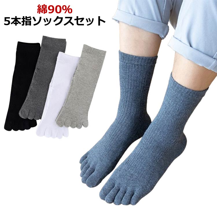 リブ編みでワンランク上の履き心地◎綿90%5本指ソックスセット。毛足の長い綿を採用し、柔らかい肌触り、通気性抜群!アッパーや履き口リブ編みで、靴下の緩みを防止し、心地よいフィット感が長持ちします。ちょうどいい丈の長さ、ビジネスもゴルフなどスポーツもこれ1つで◎5本指のくつしたならそれぞれの指が包み込まれるのできじが汗を吸収しムレにくく足の臭いも軽減。普通のくつ下に比べて保温性が高く、血行が良くなるのでむくみや冷え対策にもおすすめです。 サイズ F サイズについての説明 F 24.5?44.5cm対応 素材 綿90% ポリウレタン10% 色 黒4足セット 白4足セット ダークグレー4足セット ライトグレー4足セット 4色セット 備考 ●サイズ詳細等の測り方はスタッフ間で統一、徹底はしておりますが、実寸は商品によって若干の誤差(1cm〜3cm )がある場合がございますので、予めご了承ください。 ●商品の色は、撮影時の光や、お客様のモニターの色具合などにより、実際の商品と異なる場合がございます。あらかじめ、ご了承ください。 ●製品によっては、生地の特性上、洗濯時に縮む場合がございますので洗濯時はご注意下さいませ。 ▼色味の強い製品によっては他の衣類などに色移りする場合もございますので、速やかに(脱水、乾燥等)するようにお願いいたします。 ▼生地によっては摩擦や汗、雨などで濡れた時は、他の製品に移染する恐れがございますので、着用の際はご注意下さい。 ▼生地の特性上、やや匂いが強く感じられるものもございます。数日のご使用や陰干しなどで気になる匂いはほとんど感じられなくなります。