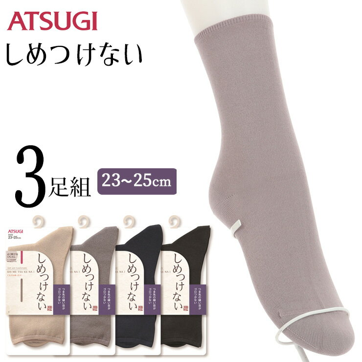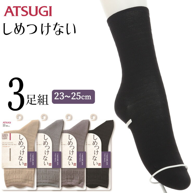 素材 レーヨン、綿、ポリエステル、ナイロン、ポリウレタン サイズ 23〜25cm 特徴 アツギ・しめつけない靴下 足を締め付けず、リラックスしてはいて頂ける心地よい靴下のブランド。 こだわりのよく伸びるソフトでゆったりしたクチゴムが特徴です。 日々の暮らしに、リラックスタイムに、介護に、スポーツに、旅行に、様々なシーンでお使い下さい。 ●洗い替えに便利な同色3足組 ●18cm丈 ●プレーン ●はきぐち幅広成型 履きやすく締め付け感がなくやさしい履き心地 ●つま先縫い目がゴロつかない 縫い目が盛り上がらず、フラットで肌にあたらない ●つま先・かかと補強 ●ノンサポーティ ●抗菌防臭加工 ●足型セット加工 配送 ネコポス配送可能商品です。 (1セットまで) ご注意 ※ネコポス(メール便)は日時指定のご利用はいただけません。 ※日時指定をご利用の場合は宅配便送料に変更させていただきます。 ■PC・スマートフォンの各メール設定により、当店からのメールが届かない場合がございます。迷惑メールフォルダ、受信設定等をご確認ください。 ■画面上と実物では多少色具合が異なって見える場合もございます。ご了承ください。