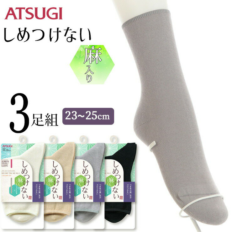 素材 綿、ポリエステル、麻、ナイロン、ポリウレタン サイズ 23〜25cm 特徴 アツギ・しめつけない靴下 足を締め付けず、リラックスしてはいて頂ける心地よい靴下のブランド。 こだわりのよく伸びるソフトでゆったりしたクチゴムが特徴です。 日々の暮らしに、リラックスタイムに、介護に、スポーツに、旅行に、様々なシーンでお使い下さい。 ●洗い替えに便利な同色3足組 ●18cm丈 ●麻入り ●クチゴムゆったり ●ノンサポーティ ●つま先・かかと補強 ●抗菌防臭加工 ●足型セット加工 配送 ネコポス配送可能商品です。 (1セットまで) ご注意 ※ネコポス配送(ポスト投函でお届け)の場合、日時指定はご利用いただけません。 ※合計2セットまではネコポス配送が優先されます。 ■PC・スマートフォンの各メール設定により、当店からのメールが届かない場合がございます。迷惑メールフォルダ、受信設定等をご確認ください。 ■画面上と実物では多少色具合が異なって見える場合もございます。ご了承ください。