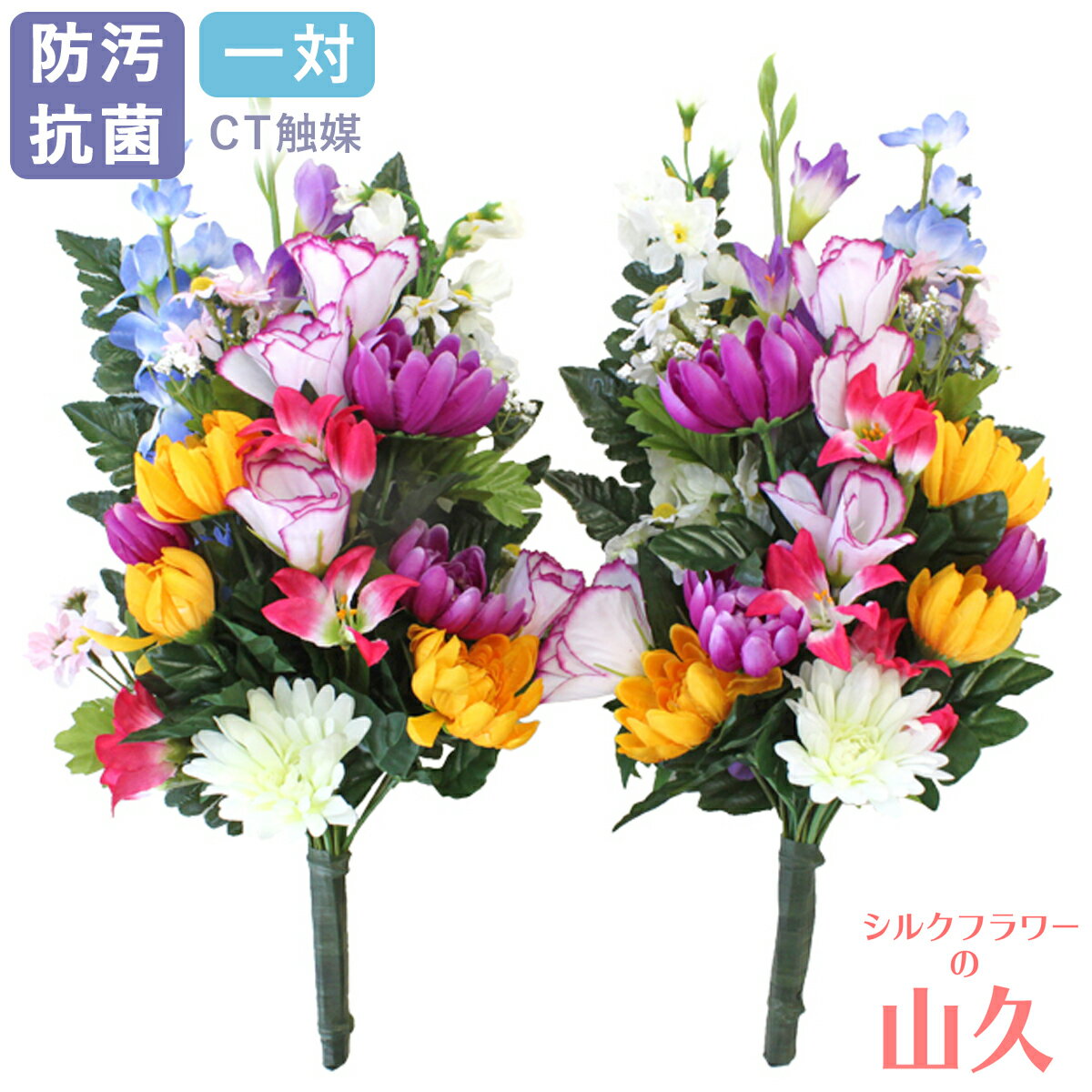 商品名 仏花 カサブランカの入ったカラフルな花束 一対 商品説明 高級感のある白のカサブランカとカラフルな色合いの花々が魅力的な仏花の花束です。 自然で上品な色合いなので地域や季節を問わず春夏秋冬いつでも飾っていただけます。 一対が左右対称になるようにデザインし、山久のフラワーアレンジャーが一つ一つ手作りで製作しているため、バランスが良く非常に見栄えがします。 花束をグリーンワイヤーで一つずつ束ねて固定してあるので、屋外のお墓に置いても雨に濡れてバラバラになるということがありません。 ワイヤーで固定後はお花用のテープにて巻き上げています。本物の茎のような見た目で、より自然な仕上がりです。 シルクフラワー(造花)の花束は、生の墓花とは異なり、猛暑が続く夏の屋外でも枯れることがなく、水替えなどのお手入れも不要で清潔できれいな状態が長く続きます。 近年では、お墓で生のお花をお供えしたままにしておくと枯れた花や葉がお墓を汚したり、小動物が荒してしまったりすることから、造花を推奨するお寺や霊園も増えてきました。 特に夏期には暑さで傷むのも早く、室内の仏壇でもすぐにしおれてしまったり、冬期は寒さで凍ってしまったりと切り花の管理は手間がかかります。 シルクフラワーの仏花は周りを汚す心配がなく、生花やプリザーブドフラワーよりも耐久性が高く長持ちするので、夏場の暑い時期や、旅行や出張などで長期不在にする時、頻繁にお墓参りに行けない方や生花の管理が大変だという方に是非おすすめの仏花です。 お墓用としてお供えするのはもちろん、仏壇用としても花粉や虫の発生を気にする必要がなく、仏壇を清潔に保てるため人気です。また、お水が不要なため普段の水やりの手間がなくなる上に、水が汚れて匂いが気になったり、子どもやペットが花瓶を倒してしまって水浸しになったりといった心配もありません。 山久のシルクフラワーにはCT触媒加工が施されているため、消臭・抗菌・防汚の作用があります。 CT触媒は光触媒加工と異なり、光が当たらない場所でも効果を発揮し、空気を綺麗にしてくれます。 サイズ 約全長43cm(水上32cm)(水下11cm)×幅18cm×奥行13cm ◎水上、水下とは 花束を水の入った花びんに入れてお供えするときに、 水面から上に出る部分を水上、水の中に入る部分を水下と呼びます。 *当店の商品はシルクフラワーを使用しているため、水は不要です。 水上:束ねたお花の根本から上の先端まで、お花や葉の部分 水下:束ねたお花の根本から下の先端まで、花びんやお墓の花立に入る茎の部分 ご購入の際の注意点 ※花材の入荷状況により、商品の仕様は変更になることがあります *受注制作のため数日お時間をいただく場合がございます *花器は商品に含まれません その他 シルクフラワーの山久の仏花の花束は受注製作品です。 埼玉県川越市の店舗でフラワーデザイナーがひとつひとつ手作りしてお届けします。 シルクフラワーとは、シルクの様な光沢のある生地を用いて作られ、 生花のような花びらのグラデーション・葉や茎の樹皮や節までリアルを追求した高品質な人工的な花のことをいいます。 他にも、一般的な造花を指すアートフラワーと呼ばれることもあります。 また、近年では呼び名が統一され、生花の代わりとなる人口的な花のことを全てまとめてアーティフィシャルフラワーと呼ばれる様になりました。 以下の用途等でお使いいただけます お悔やみ 周忌 四十九日 法要 法事 弔事 供養 御霊前 年末年始 お正月 お盆 初盆 帰省 お彼岸 月命日 命日 供花 お供え花等 仏花の花束の固定に便利なアイテム お墓の花立てへの固定に 花立てキャップ 花瓶や花器への固定に ブッカバー