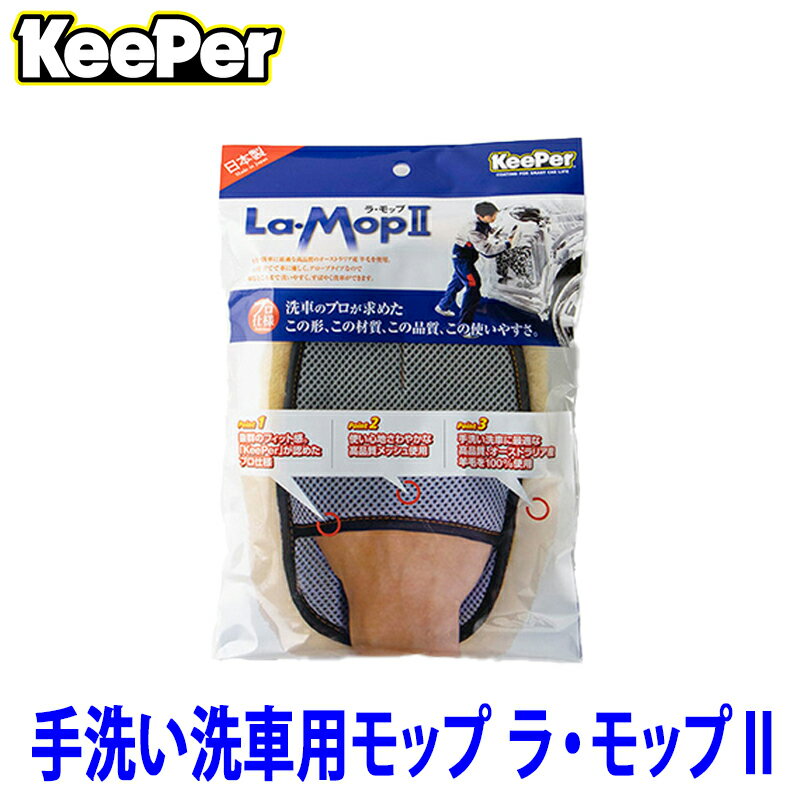 【商品説明】 高密度の羊毛が、洗車中に出る細かな砂粒をしっかりと毛の間に包み込み、大切な愛車への傷付きを高度に防ぎます。柔らかくしなやかな羊毛がボディに優しく寄り添い、グローブタイプだから細かい部分もすばやく、丁寧に洗えます。 【ポイント】 (1)抜群のフィット感。『KeePer』が認めたプロ仕様 (2)使い心地さわやかな高品質メッシュ使用 (3)手洗い洗車に最適な高品質、オーストラリア産羊毛を100%使用 【ラ・モップIIの正しい使い方】 ・使用前に水に浸し、羊毛部分に水分をなじませてからお使いください。 ・使用後はきれいな水で洗剤分をよくすすいでください。 ・すすいだ後は、絞らずモップを振って、よく水を切り風通しのよい日陰で保管してください。 【使用上の注意】 ※天然物につき毛が剥がれてしまうものがあります。 ※ラ・モップIIの羊毛部分は100%天然素材です。そのため、若干の個体差があります。 ※稀にですが、使用開始直後に羊毛部分が剥がれ落ちてしまうものがあります。 【ラ・モップIIを長くお使いいただくために】 ・洗濯機で洗わないでください。 ・乾燥機を使用しないでください。 ・強い力でもみ洗いしないでください。 ・水に浸したまま放置しないでください。 ・直射日光に当てて乾燥させないでください。 ・アルカリ洗剤・漂白剤を使用しないでください。 ※画像はイメージです。実際の商品とは異なる場合がございます。 ※パッケージにつきましては、メーカーの仕様変更等により予告なく変更になる場合がございます。パッケージの違いによる返品・交換は承っておりませんので予めご了承ください。
