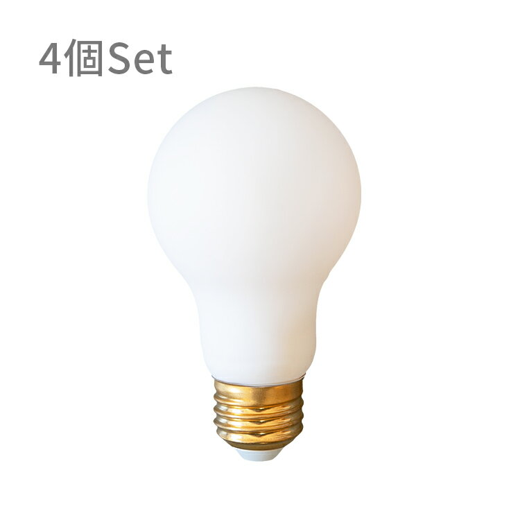 DETAILS・商品詳細 暮らしになじむ、やさしい灯りのLED電球 従来のLED電球にありがちなメカニカルな印象を抑え、デザイン性にもこだわったフロストタイプのLED電球です。さらりとした質感の乳白色のガラスが灯りをやさしく包み、白熱球のようなあたたかみのある灯りを演出。点灯時はもちろん、消灯時も美しく、インテリア空間を上質な雰囲気に変えてくれます。 商品サイズ 電球サイズ:直径60×高さ108(mm) 材質 ガラス、アルミニウム 重量 約35(g) ×4 仕様 明るさ / 約700lm(白熱球55W相当) 色温度 / 2700K(電球色) 消費電力 / 約7.5W 口金 / E26 配光角度 / 約360度 定格寿命 / 約15,000時間 電圧 / 100V(50/60Hz) 推奨使用周囲温度 / -20?60℃ 使用場所 / 屋内用 密閉器具 / 非対応 ダウンライト/非対応 注意事項 調光機器のついた照明器具や回路には使用できません。 密閉または密閉に近い器具には使用できません。 人感スイッチなど自動点滅装置や遅れ停止スイッチなどには使用できない場合があります。 水滴がかかる場所、結露が起こる環境では使用できません。 リモコンのついた照明器具や回路では使用できない場合がございます。 ほたるスイッチでの使用不可(ほたるスイッチには微弱電流が絶えず流れており、消灯時にLED電球が微弱電流を受けて点滅する現象が起きる場合がございます。) LED光源にはバラツキがあるため、同じ商品でも個体差が出る場合がございますのでご了承下さい。 断熱材施工器具(SGI、SG、SB形表示器具)では使用できません。ダウンライト等でのご使用の場合はご確認下さい。 LED電球対応の照明器具にてご使用下さい。 照明器具は説明書のご確認、各メーカーへ問い合わせ下さい。 備考 お買い物の際の注意事項は、会社概要の「その他の注意点」を必ずご確認ください。 商品紹介 ● POINT1 やわらかく広がる電球色の灯り フロストガラス越しに広がる電球色の灯りが、空間をふんわり包みます。直視してもまぶしさを感じづらく、リラックスシーンにぴったりの灯りです。 ● POINT2 消灯時も美しいデザイン やわらかな白をまとったガラスが空間に溶け込み、まるでインテリアの一部のよう。上質で抜け感のある、美しいLED電球です。 ● POINT3 配光角度 360° 一般的なLED電球は光が前方向に広がるため、配光角度は約200°程度に対しフロスト電球は約360°灯りが広がります。真下だけでなく、周囲全体に柔らかな灯りが広がるので、お部屋を明るい印象にしてくれます。 ● POINT4 照明器具に合わせやすいA形電球 一般的な照明器具に対応しやすい形状なので、どんな照明器具にも合わせやすく、空間になじみやすいデザインです。