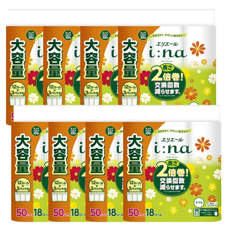 ※こちらの商品はお取り寄せ商品のため、初期不良以外の返品・交換は承れませんので、あらかじめご了承ください。 やわらかく、やさしい肌ざわりで、長さ2倍巻のトイレットペーパー(ダブル)です。 1ロール50m、たっぷり使えて交換回数を減らせて便利。 吸水性に優れているので、温水洗浄トイレにも適しています。 蛍光染料は使用していません。 華やぐフローラルの香り。 ※リニューアルに伴い、パッケージ・内容等予告なく変更する場合がございます。予めご了承ください。 ●セット内容:18ロール入×8個 ●商品サイズ(1個あたり/cm):幅約34×奥行約22.5×高さ約33 ●ペーパー寸法:幅110mm×2枚重ね 長さ50m ●材質:ピュアパルプ100% ●注意事項:トイレの詰まりを防止するために、一度に多量の紙を流さないでください。 ★関連商品はこちら★ ★エリエール イーナ トイレットティシュー2倍巻き 18ロール ダブル 幅110mm×50m ★【4個】エリエール イーナ トイレットティシュー2倍巻き 18ロール ダブル 幅110mm×50m ★エリエール イーナ トイレットティシュー2倍巻き 18ロール シングル 幅110mm×100m ★エリエール イーナ トイレットティシュー シャワー用2倍巻き 12ロール ダブル 幅110mm×46m ★【6個】エリエール イーナ トイレットティシュー シャワー用2倍巻き 12ロール ダブル 幅110mm×46m ★【4個】エリエール イーナ トイレットティシュー2倍巻き 18ロール シングル 幅110mm×100m ★【8個】エリエール イーナ トイレットティシュー2倍巻き 18ロール シングル 幅110mm×100m (検索用:大王製紙 elleair トイレットペーパー ダブル 18ロール i:na 2倍巻き フローラルの香り 50m 2倍巻 4902011825756) 最強翌日配送対象商品に関するご案内 最強翌日配送対象商品・対象地域に該当する場合は最強翌日配送マークがご注文カゴ近くに表示されます。 最強翌日配送可能なお支払方法は【クレジットカード、代金引換、全額ポイント支払い】のみとなります。 下記の場合は最強翌日配送対象外となります。 ・15点以上ご購入いただいた場合 ・時間指定がある場合 ・ご注文時備考欄にご記入がある場合 ・決済処理にお時間を頂戴する場合 ・郵便番号や住所に誤りがある場合 ・最強翌日配送対象外の商品とご一緒にご注文いただいた場合 ・お届け先住所文字数が40文字以上の場合 関連キーワード(本商品の説明ではありません) 母の日 父の日 敬老の日 こどもの日 クリスマス バレンタイン ホワイトデー ハロウィン お正月 成人の日 成人式 記念日 誕生日 卒業式 入学式 お歳暮 お中元 春 夏 秋 冬 梅雨 節分 ひな祭り 七夕 十五夜 初詣 年越し 夏祭り 花火大会 結婚祝い 内祝い 出産祝い 快気祝い 還暦祝い 古希 喜寿 傘寿 米寿 卒寿 白寿 百寿 新築祝い 引っ越し祝い 開店祝い 開業祝い 就職祝い 昇進祝い 合格祝い 銀婚式 金婚式 七五三 長寿祝い 御礼 お母さん お父さん 義母 義父 祖父 祖母 おばあちゃん おじいちゃん 娘 息子 彼氏 彼女 恋人 友達 上司 先輩 後輩 同僚 キッズ 子供 幼児 ベビー 赤ちゃん 育児 学生 社会人 シニア 10代 20代 30代 40代 50代 60代 70代 80代 90代 一人暮らし 単身赴任 主婦 主夫 新生活 家族暮らし 子育て 旅行 トラベル ライブ ホームパーティ ビジネス 法人 ギフト プレゼントご注文前のよくある質問についてご確認下さい[ FAQ ]