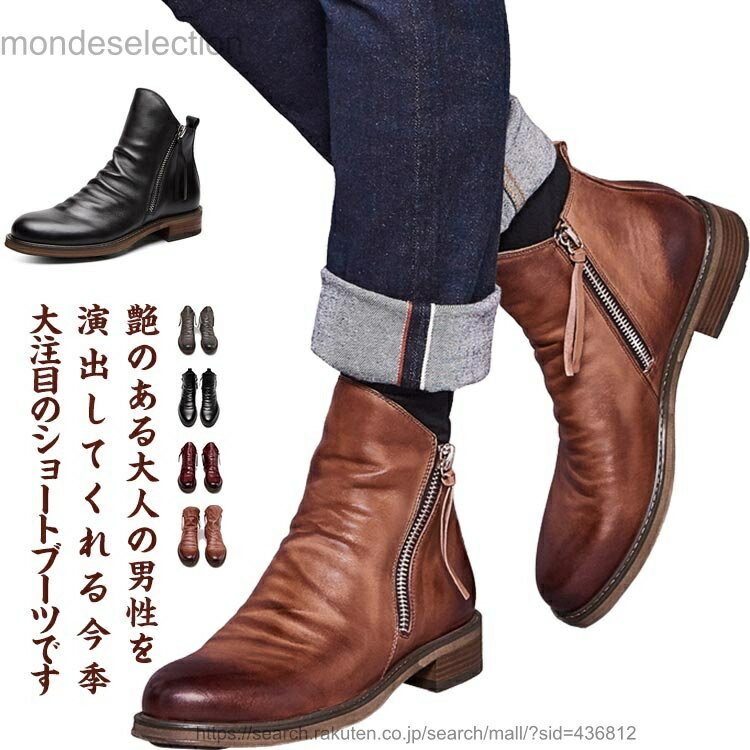 艶のある大人の男性を演出してくれる今季大注目のショートブーツです。焦がし加工によるヴィンテージ仕上げで本革に劣らない風合いを醸し出しています。アッパーのドレープが程良いこなれ感が演出し、細かな細工が足元を引き立たせます。両サイドのジッパーで着脱簡単な部分も嬉しいポイント。シーズン問わず使えるブーツなので、1足は持っておきたい必須アイテムです。スマートなシルエットに、ドレープのきいたデザインはこなれ感を演出し、大人の色気を漂わす。両サイドに施されたジッパーは、控え目な出で立ちの中に、アクセサリーを付けたような存在感。 サイズ38/24.0cm 39/24.5cm 40/25.0cm 41/25.5cm 42/26.0cm 43/26.5cm 44/27.0cm 45/27.5cm 46/28.0cm 47/28.5cm 48/29.0cmサイズについての説明38/24.0cm 39/24.5cm 40/25.0cm 41/25.5cm 42/26.0cm 43/26.5cm 44/27.0cm 45/27.5cm 46/28.0cm 47/28.5cm 48/29.0cm素材人工皮革、ゴム色ブラウン ブラック グレー ワイン備考 ●サイズ詳細等の測り方はスタッフ間で統一、徹底はしておりますが、実寸は商品によって若干の誤差(1cm〜3cm )がある場合がございますので、予めご了承ください。●製造ロットにより、細部形状の違いや、同色でも色味に多少の誤差が生じます。●パッケージは改良のため予告なく仕様を変更する場合があります。▼商品の色は、撮影時の光や、お客様のモニターの色具合などにより、実際の商品と異なる場合がございます。あらかじめ、ご了承ください。▼生地の特性上、やや匂いが強く感じられるものもございます。数日のご使用や陰干しなどで気になる匂いはほとんど感じられなくなります。▼同じ商品でも生産時期により形やサイズ、カラーに多少の誤差が生じる場合もございます。▼