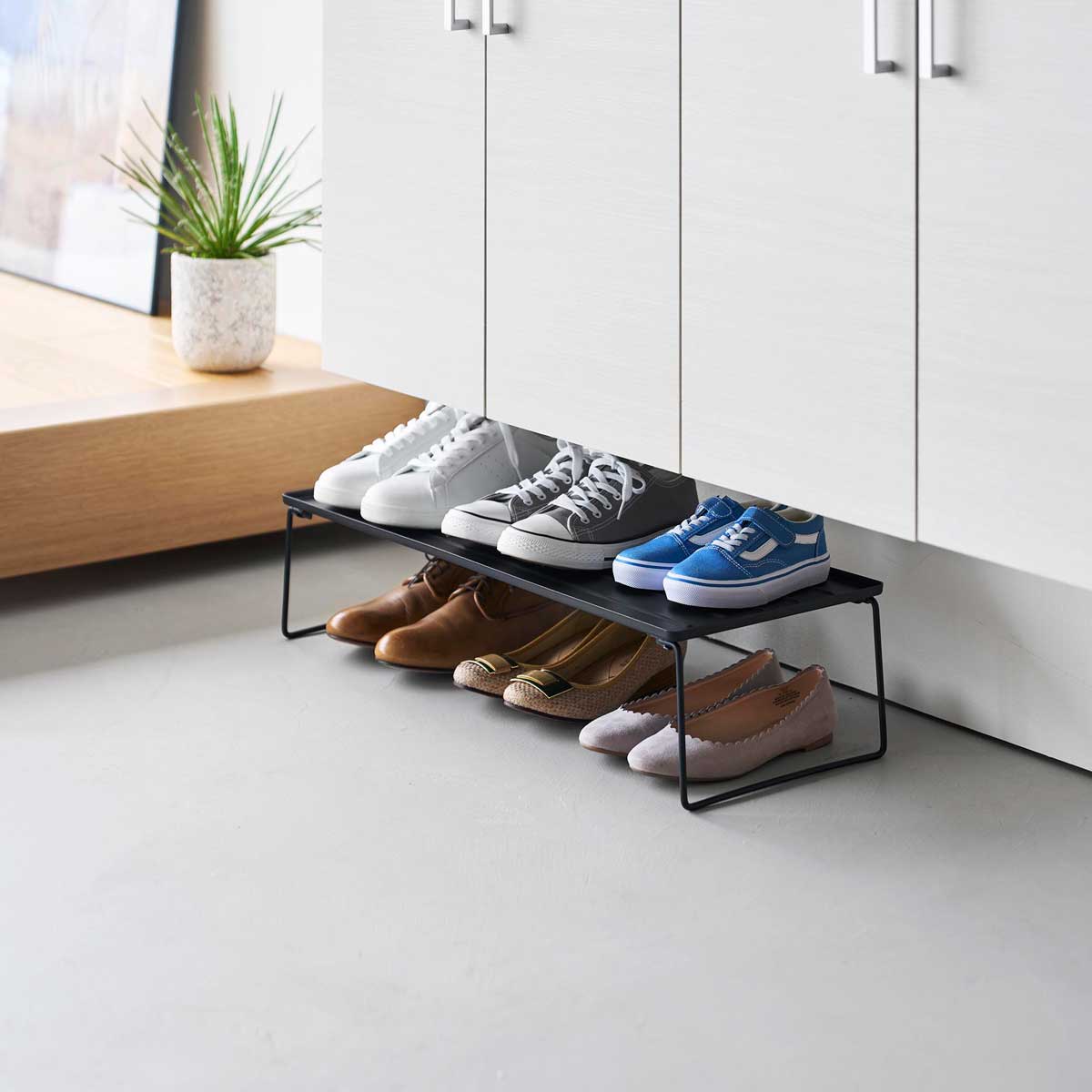 砂やほこりが下に落ちにくい 靴の砂やほこりなどが下に落ちにくい、トレータイプの折り畳みシューズラックです。使わないときは脚部を折り畳んで、コンパクトに収納できます。最大3段までスタッキング可能。本製品は1個入りです。 最大3段までスタッキング可 下駄箱下の空いているスペースを活用して靴の収納場所を増やしたり、スペースに合わせてラックをスタッキングして使用できます。丈夫なスチール製なので、シューケア用品なども靴と一緒に置けて便利です。 商品の情報 ・ブランド:YAMAZAKI(山崎実業)/日本 ・ジャンル:シューズラック ・主な素材:スチール 粉体塗装 ・生産国:中国 ・サイズ:約W664xD270xH163mm(使用時)/約W660xD270xH45mm(収納時) ・内寸サイズ:約W657xD268xH5mm(トレー)/約W655xH153cm(ラック下 有効内寸、ヒンジ部含まず) ・重量:約2100g ・耐荷重:3kg(静止荷重) ・収納可能数の目安:3足(大人用シューズ、サンダル、ヒール)※サイズや形状によっては収納できない場合もあります。 この商品の仲間たち tower タワー 折り畳みシューズラック 10362 ホワイト tower タワー 折り畳みシューズラック 10363 ブラック