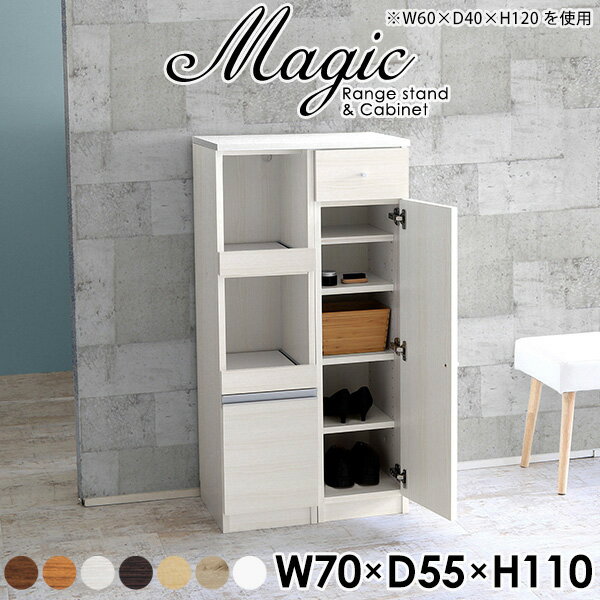 玄関収納におすすめ!シューズラック 下駄箱magic レンジ台×キャビネット W70×D60×H120 木目サイズサイズ:約幅700 奥行き600 高さ1200 mm材質[天板・スライド棚]メラミン樹脂化粧合板[前板]ブラウン・ダークブラウン・チーク/デルナチュレ化粧合板ホワイト/ポリエステル化粧合板ナチュラル・ホワイトウッド・オーク/強化紙[側板・内部]プリント化粧合板カラーブラウン/ダークブラウン/ホワイト/北欧チーク/ナチュラル/ホワイトウッド/オークからお選び下さい。※モニターなどの閲覧環境によって、実際の色と異なって見える場合がございます。仕様日本製天板・各ユニット分割式でお客様連結作業あり連結金具付属耐荷重:天板50kg、スライド棚15kg、棚板5kg可動棚板:3枚棚板の厚み:20 mm背面化粧仕上げ(一部タッカー留め)コンセント1口付き(合計1500Wまで使用可能)2箇所ブランド 送料送料無料※北海道・沖縄・離島は送料別途お見積もり。納期ご注文状況により納期に変動がございます。最新の納期情報はカラー選択時にご確認ください。※オーダー商品につき、ご注文のキャンセル・変更につきましてはお届け前でありましても生産手配が済んでいるためキャンセル料(商品代金の50%)を頂戴いたします。※商品到着までの日数は、地域により異なりますご購入時にお届け日の指定がない場合、最短日での出荷手配を行いメールにてご連絡させていただきます。配送・開梱設置について※北海道・沖縄・離島は送料別途お見積もりいたしましてご連絡いたします。【ご注意ください】離島・郡部など一部配送不可地域がございます。配送不可地域の場合は、通常の配送便での玄関渡しとなります。運送業者の便の都合上、地域によってはご希望の日時指定がお受けできない場合がございます。建物の形態(エレベーターの無い3階以上など)によっては別途追加料金を頂戴する場合がございます。吊り上げ作業などが必要な場合につきましても追加料金はお客様ご負担です。サイズの確認不十分などの理由による返品・返金はお受けできません。※ご注文前に商品のサイズと、搬入経路の幅・高さ・戸口サイズなど充分にご確認願います。→ 詳しくはこちら備考【スライド蝶番を使用している扉の調整方法】商品到着時、また長期使用で生じる扉のズレや歪みは、蝶番の調節ネジで扉部分を前後・左右へ移動して調節をお願い致します。※製造上の都合や商品の改良のため、予告なく仕様変更する場合がございますので予めご了承ください。当店オリジナル家具を全部見る同じサイズのデザイン違いはこちら管理番号0000ac002647/0000ac002648/0000ac002649/0000ac002650/0000ac002651/0000ac002652/0000ac002653/メーカー希望小売価格はメーカーカタログに基づいて掲載しています■おすすめラインナップこのページは magic レンジ台×キャビネット 幅70×奥行60×高さ120cm 木目 のページです。レンジ台には家電製品を置いてもスムーズに出し入れできるスライド棚がついており、1口コンセント付きです。(合計1500Wまで使用可能)引き出しはたっぷり入る深めのタイプで、鍋やフライパンのように嵩張るものもまとめて片づけられます。キャビネットは小物類の収納に便利な引き出し収納と、可動棚で仕舞うアイテムのサイズに合わせた収納ができる扉収納になっています。ツヤのある、高級感を感じさせるメラミン樹脂化粧合板を使用した天板。擦り傷や熱に強く、汚れてもサッと拭き取りやすいのでキッチンの作業スペースやダイニングでの利用におすすめ。『magic(マジック)』はレンジ台と様々な組み合わせを楽しめるシリーズです。サイズ展開も豊富なので、複数を並べることで壁面いっぱいに収納スペースを作ったり、作業台を中心にして広々としたワークスペースにすることも可能です。