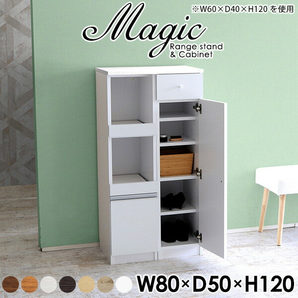 玄関収納におすすめ!シューズラック 下駄箱magic レンジ台×キャビネット W80×D50×H120 木目サイズサイズ:約幅800 奥行き500 高さ1200 mm材質[天板・スライド棚]メラミン樹脂化粧合板[前板]ブラウン・ダークブラウン・チーク/デルナチュレ化粧合板ホワイト/ポリエステル化粧合板ナチュラル・ホワイトウッド・オーク/強化紙[側板・内部]プリント化粧合板カラーブラウン/ダークブラウン/ホワイト/北欧チーク/ナチュラル/ホワイトウッド/オークからお選び下さい。※モニターなどの閲覧環境によって、実際の色と異なって見える場合がございます。仕様日本製天板・各ユニット分割式でお客様連結作業あり連結金具付属耐荷重:天板50kg、スライド棚15kg、棚板5kg可動棚板:3枚棚板の厚み:20 mm背面化粧仕上げ(一部タッカー留め)コンセント1口付き(合計1500Wまで使用可能)2箇所ブランド 送料送料無料※北海道・沖縄・離島は送料別途お見積もり。納期ご注文状況により納期に変動がございます。最新の納期情報はカラー選択時にご確認ください。※オーダー商品につき、ご注文のキャンセル・変更につきましてはお届け前でありましても生産手配が済んでいるためキャンセル料(商品代金の50%)を頂戴いたします。※商品到着までの日数は、地域により異なりますご購入時にお届け日の指定がない場合、最短日での出荷手配を行いメールにてご連絡させていただきます。配送・開梱設置について※北海道・沖縄・離島は送料別途お見積もりいたしましてご連絡いたします。【ご注意ください】離島・郡部など一部配送不可地域がございます。配送不可地域の場合は、通常の配送便での玄関渡しとなります。運送業者の便の都合上、地域によってはご希望の日時指定がお受けできない場合がございます。建物の形態(エレベーターの無い3階以上など)によっては別途追加料金を頂戴する場合がございます。吊り上げ作業などが必要な場合につきましても追加料金はお客様ご負担です。サイズの確認不十分などの理由による返品・返金はお受けできません。※ご注文前に商品のサイズと、搬入経路の幅・高さ・戸口サイズなど充分にご確認願います。→ 詳しくはこちら備考【スライド蝶番を使用している扉の調整方法】商品到着時、また長期使用で生じる扉のズレや歪みは、蝶番の調節ネジで扉部分を前後・左右へ移動して調節をお願い致します。※製造上の都合や商品の改良のため、予告なく仕様変更する場合がございますので予めご了承ください。当店オリジナル家具を全部見る同じサイズのデザイン違いはこちら管理番号0000ac002472/0000ac002473/0000ac002474/0000ac002475/0000ac002476/0000ac002477/0000ac002478/メーカー希望小売価格はメーカーカタログに基づいて掲載しています■おすすめラインナップこのページは magic レンジ台×キャビネット 幅80×奥行50×高さ120cm 木目 のページです。レンジ台には家電製品を置いてもスムーズに出し入れできるスライド棚がついており、1口コンセント付きです。(合計1500Wまで使用可能)引き出しはたっぷり入る深めのタイプで、鍋やフライパンのように嵩張るものもまとめて片づけられます。キャビネットは小物類の収納に便利な引き出し収納と、可動棚で仕舞うアイテムのサイズに合わせた収納ができる扉収納になっています。ツヤのある、高級感を感じさせるメラミン樹脂化粧合板を使用した天板。擦り傷や熱に強く、汚れてもサッと拭き取りやすいのでキッチンの作業スペースやダイニングでの利用におすすめ。『magic(マジック)』はレンジ台と様々な組み合わせを楽しめるシリーズです。サイズ展開も豊富なので、複数を並べることで壁面いっぱいに収納スペースを作ったり、作業台を中心にして広々としたワークスペースにすることも可能です。