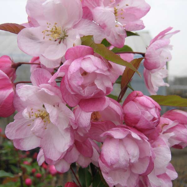 華やかな八重咲きカイドウ花木 庭木の苗/クラブアップル(マルス):ヴァンエセルティン5号ポットバラ科の落葉広葉樹で、ハナリンゴ(マルス・クラブアップル)の1種です。ズミとも呼ばれます。春の花を代表する、見事なピンクの花を咲かせます。建物のまわりに植えたり、庭園樹としておすすめです。ヴァンエセルティンはふっくらした華やかな八重咲き。開花期は4〜5月頃で、咲き始めは紅色、開くとピンクとなります。花柄は長く垂れ下がります。花後に直径2cmほどの小さなマメ状の赤みがかった黄色の果実がつきます。樹形は立性でまっすぐ上に伸長しますのでシンボルツリーにもおすすめです。学名:Malus 'Van Eseltine'タイプ:バラ科リンゴ属の耐寒性落葉樹樹高:6〜8m開花時期:4〜5月植栽適地:比較的冷涼な地域。東北以北および中部地方の高冷地。適切な管理を行えば全国で栽培可能ですが、暖地では実に赤い色がつきにくくなります。日照:日なたを好む栽培方法:日当たり、水はけのよい場所に植えつけます。赤星病予防のため、カイヅカイブキなどのイブキ類との混植は避けてください。また、春先のアブラムシに注意してください。高温乾燥に注意してください。移植は容易です。剪定は落葉後から芽吹き前に行います。萌芽力がありますが、あまり強く刈り込むと花つきが悪くなります。病害はほとんどありません。挿し木か実生で殖やすことができます。お送りする苗は5号(直径15cm)ポット苗、樹高約80cmです。樹高につきましては入荷時期により多少変動することがあります。写真は成長・開花時のイメージです。