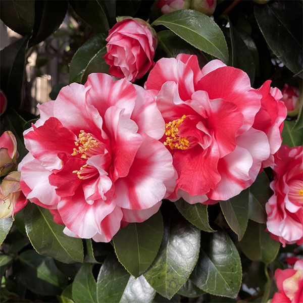 11月〜4月開花 大輪品種 清緋・照日・清日・絞太神楽 江戸椿花木 庭木の苗/ツバキ(椿):太神楽(ダイカグラ)4号ポット国内の古典品種から海外の希少種・最新品種まで、幅広く優れた椿の収集とオリジナル品種の育成を行う愛知県の「前田ナーセリー」の椿苗です。太神楽(だいかぐら)は江戸椿を代表する古典椿の一つ。紅色地に白の斑が入る色鮮やかな花です。別名清緋、照日、清日、絞太神楽。獅子〜牡丹咲きの大輪品種です。秋から咲きはじめ、春先まで長く咲き続けます。タイプ:ツバキ科ツバキ属の耐寒性常緑小高木樹高:2〜4m開花期:11〜4月栽培適地:東北地方以南日照:日向または半日陰(開花するようになると日向のほうが適しています)栽培方法日当たり、水はけの良い場所を好みます。酸性土を好むので、植え付けの際に植え穴にピートモス、腐葉土またはブルーベリー栽培用土などを混ぜ込んでください。2〜3月に寒肥として、油粕や骨粉を根元に施します。剪定は花後すぐに行います。葉芽の先に花がつくので、葉芽を残すように間引き剪定をします。夏に花芽が分化するので、夏以降は枝を切らないようにしてください。ツバキには4月と7月頃にチャドクガが発生しやすいので、殺虫剤で駆除してください。4号(直径12cm)ポット植え、樹高約40cmです。写真は成長・開花時のイメージです。