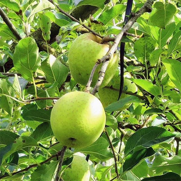 蜜が多く香りがよい岩手県内の「幻のリンゴ」果樹の苗/リンゴ:青林(セイリン)4〜5号ポット青林(せいりん)は、岩手県内のみで生産されていた幻のリンゴ。完熟しても落果せず、甘みとみつが多く、香りがあります。果重350g前後。糖度22度ぐらい。授粉樹「王林」などが適しています。タイプ:バラ科サクラ属の耐寒性落葉樹栽培適地:比較的冷涼な地域。東北以北および中部地方の高冷地。適切な管理を行えば全国で栽培可能です。果重:300〜350g果皮色:黄〜橙紅色成熟期:10月下旬〜11月上旬日照:日向むき栽培方法:日当たりと排水のよい場所に植えます。夏の暑さに弱いので、西日のあたる場所は避けてください。植え穴を大きく掘り、堆肥10kgを土とよく混ぜて入れます。接木の部分を地上に出して植え付けてください。苗木には丈夫な支柱を深く埋めて立てます。肥料は5月下旬、7月下旬と12月に有機肥料を中心に根元に施します。4月下旬に開花後、35日以内に摘果して40〜70枚の葉に1個の割合で実をのこします。摘果後は害虫防除のため袋がけされることが多いのですが、味が多少落ちます。家庭用なら無袋の方がおいしくなります。りんごは病虫害に弱いので、栽培ガイドなどの薬剤散布暦に従って防除してください。特に、庭木のカイヅカイブキなどのビャクシン類は赤星病を仲介しますので、近くに植えないように注意し、発生時にはダイセンなどを散布してください。病気は雨にあたった後に発生しやすいので、鉢植えで育てる場合は雨にあてないようにすると防ぐことができます。お届けするのは、4〜5号(直径12〜15cm)ポット入りの接木苗です。結実までの年数は約3〜4年です。樹高は多少前後します。夏以降は葉が傷んだ状態、冬から春先は落葉状態となります。写真はイメージです。リンゴ:青林(セイリン)4〜5号ポットの栽培ガイドりんごの栽培方法
