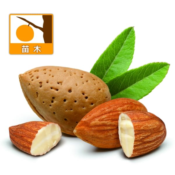 甘みとコクの美しいアーモンド果樹の苗/スイートアーモンド:ノンパレル4号ポットノンパレルは甘みとコクが特徴で、粒がそろいやすく割れも少ないので安定した品質が見込めます。1本では実がなりにくいので、異なる品種と一緒に育てます。カリフォルニアで最も多く栽培される代表品種です。西アジア原産のバラ科のナッツ、桃の仲間なので、栽培方法は桃と同じです。果実の核の仁(じん・種子の種皮を除いた部分)を食用にします。3〜4月頃に桃に似た、真っ白のきれいな花を咲かせます。8月末ころから、果肉が成熟して果皮がはじけたら収穫してください。あるいは、実を収穫後に果肉を取り除いて1週間ほど陰干しします。その後殻を割れば、中の実がアーモンドです。炒って食べると美味です。夏から秋にかけて、緑色の枝がところどころ黒くなる場合がありますが、生育には問題ありません。タイプバラ科サクラ属の耐寒性落葉高木栽培適地年平均気温11〜15度の地域樹高3〜5m収穫期8〜9月日照日向むき栽培方法:日当たり・水はけのよい場所で育てます。肥料は窒素分を控えて有機肥料を中心に、5月、収穫後の8月下旬、そして12月に寒肥を根元に施します。新梢(1年枝)に花芽ができます。開花後30日くらいで整理落果が終わるので、摘果をして実数を調整します。実1個に対して25〜30枚の葉が必要です。木が大きくなるので、毎年12月〜2月の間に剪定を行います。日照不足になると下枝が枯れますので、混み合った側枝を間引き、枝の間に日光がはいるようにします。5〜10月にコスカシバの幼虫が幹に入ることがあります。幹に糞がつくので、木槌でたたいて圧死させます。防除は8月下旬〜9月下旬にスミチオン乳剤を太い幹に数回散布してください。お届けする苗は、4号(直径12cm)ポット入り、結実までの年数は3〜4年です。樹高や樹形につきましては、お届け時期により多少異なることがあります。また、夏〜秋のお届け時は葉の状態が見苦しい場合がございます。冬季は落葉の状態でのお届けです。※1年生苗は鉢上げして時間が経過していないため、枝数や細根が少なかったりする場合がございますが、生育に問題はございません。■この商品は第二配送センターよりお届けします。下記サービスについてはお受けできません。・メッセージカード・栽培ガイドの添付・ラッピング・代金引換決済・時間帯指定は地域によりご指定がお受けできない場合があります・配送業者の指定