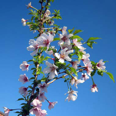 サクラ花木 庭木の苗/桜:湖上の舞(こじょうのまい)3.5号ポット[4月頃開花 鉢植えで花を咲かせる豆桜]関東周辺の山野に分布する富士桜(フジザクラ)の仲間で富士山の山中で発見された雲竜わい性品種。若木のうちは目立ちませんが、少し古木になると枝がうねるように展開し、枝ぶりに変化が出てきます。直径2〜3cmの白〜淡いピンク色の小輪一重の花を咲かせます。樹形が小型にまとまり花つきがよいので、鉢植えや狭い庭でも楽しめます。学名:Prunus incisa 'kojou no mai'タイプ:バラ科の耐寒性落葉小高木花形:一重咲花の大きさ:小輪花色:淡桃開花期:4月頃栽培適地:東北地方以南用途:庭植え、鉢植え日照:日向むき お届けする苗は3.5号(直径10.5cm)ポット植えの苗です。樹高は多少変動します。写真は成長開花時のイメージです。