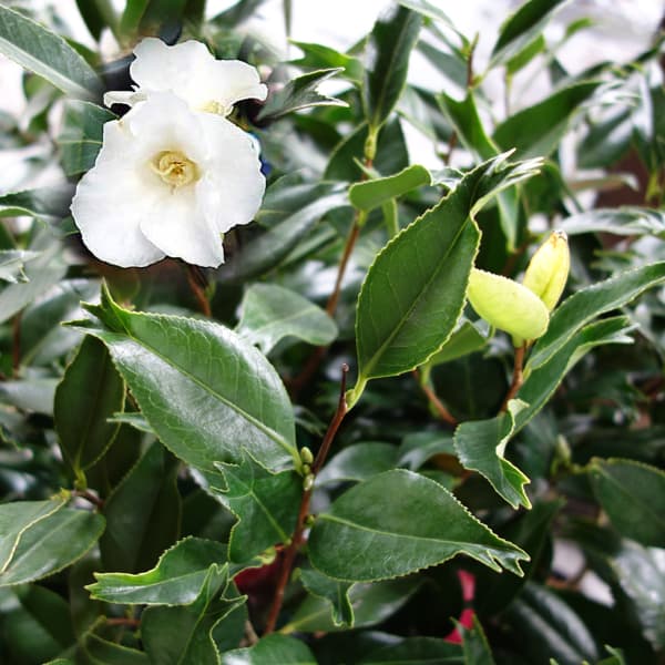 11月〜3月開花 中輪 白の唐子咲き花木 庭木の苗/ツバキ(椿):白腰蓑(しろこしみの)4.5号ポット白腰蓑は白色一重の唐子咲きツバキです。白卜伴と花形は似ていますが、白卜伴は小輪、白腰蓑は中輪タイプです。鉢植えにおすすめです。タイプ:ツバキ科ツバキ属の耐寒性常緑小高木樹高:2〜3m開花期:11〜3月植え付け適期:9〜10月、2〜4月栽培適地:東北地方以南日照:日向または半日陰(開花するようになると日向のほうが適しています)栽培方法日当たり、水はけの良い場所を好みます。酸性土を好むので、植え付けの際に植え穴にピートモス、腐葉土またはブルーベリー栽培用土などを混ぜ込んでください。2〜3月に寒肥として、油粕や骨粉を根元に施します。剪定は花後すぐに行います。葉芽の先に花がつくので、葉芽を残すように間引き剪定をします。夏に花芽が分化するので、夏以降は枝を切らないようにしてください。ツバキには4月と7月頃にチャドクガが発生しやすいので、殺虫剤で駆除してください。4.5号(直径13.5cm)ポット入りです。樹高は多少変動します。写真は開花時のイメージです。お届け時期により開花後となる場合があります。
