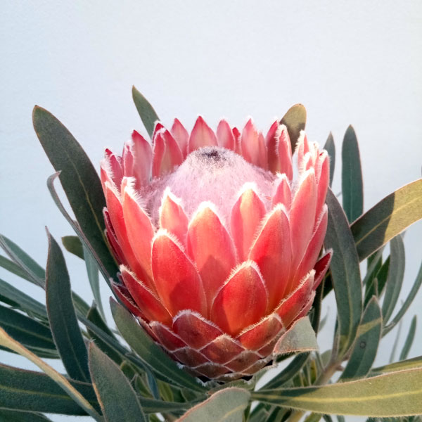 エキゾチックな花を咲かせるオーストラリアの常緑樹花木 庭木の苗/[ザ・ファームセレクト]プロテア:リトルプリンス5号鉢植え*プロテア属はオーストラリアや南アフリカなどに分布する常緑低木です。多数の花が集まって頭状花序をなし、着色した総苞が美しくそれを取り囲みます。花持ちがよく切花として注目され、またドライフラワーになります。リトルプリンスはプロテアの中ではコンパクトな樹形となるタイプで、鉢植えや小さな庭での栽培に最適です。花は直径20cmで、総苞は赤く着色します。花開くと王冠のように立派です。卵形の丸い緑葉とのコントラストも鮮やか。気候が合えば、真冬以外年間を通して繰り返し花をつけます。タイプヤマモガシ科プロテア属の半耐寒性常緑中木樹高1m、葉張り70cm開花期5月〜10月耐寒性マイナス6度まで日照日向むき栽培方法:日当たりの良い場所で、排水の良い土を好みます。育てやすい品種ですが、耐寒性がやや弱いので庭植えは関東地方以南の太平洋側で。冬場は根元に腐葉土などでマルチングし、防寒してください。寒い地方では鉢植えにして冬季は室内にとりこんでください。肥料は控えめに与えます。※お届け時期により開花後となる場合もあります。樹高・樹形は個体差があります。写真は開花時のイメージです。
