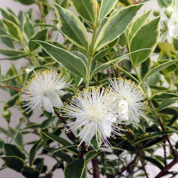 ハーブとしても人気の常緑低木 カラーリーフ 庭園植栽・鉢植えに花木 庭木の苗/マートル(ギンバイカ・銀梅花):細葉斑入り4号ポット★入荷から日数が経ったためセール価格となりました。商品の状態は画像と異なる場合があります。★マートルは地中海沿岸から南西ヨーロッパ原産のフトモモ科の常緑低木。和名はギンバイカです。ギリシャ神話では美の女神ヴィーナスと愛の象徴とされることから、結婚式のリースにも使われます。5〜6月に梅のような花弁でおしべが多数ある独特の花を咲かせ、光沢のある葉は強い香りを放ちます。耐寒性もあり、ヨーロッパ風の庭園樹として注目されています。この品種は斑入りの細葉タイプで成長が遅めなので、鉢植えや狭いスペースの植栽にも好適です。この品種は一般的な斑入りマートルよりも葉が細く、スタイリッシュな印象です。タイプ:フトモモ科の耐寒性常緑低木樹高:約1m前後花期:5〜6月日照:日向むき耐寒性:マイナス5度栽培方法:日当たり、水はけのよい場所に植えてください。できれば、風雨のあまりあたらない場所の方がよいです。花後の8月上旬に翌年の花芽ができるので、剪定は花後すぐに行います。長く伸びすぎた枝は樹形を乱し花付きも悪いので、先端を切り詰めます。また、枯れた枝や重なり合った枝、逆枝(地面に向かって伸びる枝)もあれば切り落とします。 耐寒性はありますが、強い寒さは苦手で寒風や霜にあたると枯れることがあります。寒冷地では鉢植えにして冬は室内に取り込んでください。夏から晩夏にかけて、茎を切り取り挿木をして殖やすことができます。ハーブとしての収穫・利用方法:蕾や開花したばかりの花が香りが強いので、摘み取って利用します。葉も随時摘み取り、どちらも乾燥させてポプリやハーブピローに利用してください。蕾や花はガクをとってサラダに散らしてエディブルフラワーとしても利用できます。ローストポークを作る際に、焼き上がりの10分前にマートルの小枝を敷くと、香りが良いです。4号(直径12cm)ポット入り、樹高約5〜15cm前後です。樹高は多少前後します。夏以降春先までは葉が傷んだ状態の場合がございます。写真は成長・開花時のイメージです。