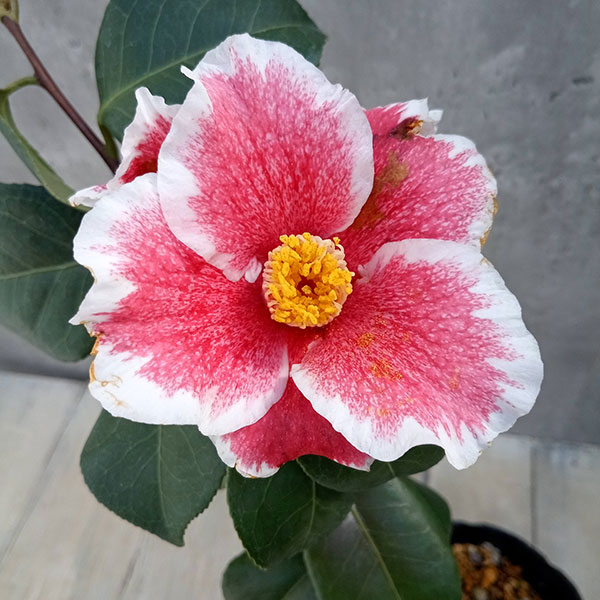 あずき色地に白覆輪 茶花に花木 庭木の苗/ツバキ(椿):隠れ磯(かくれいそ)4.5号ポット隠れ磯はお茶席によく使われる人気の椿です。アズキ色に白覆輪の一重盃咲き。あずき色の椿は珍しく、渋みのある色目が魅力です。「日本の誉」枝変わり。タイプ:ツバキ科ツバキ属の耐寒性常緑小高木樹高:2〜3m開花期:11〜4月植え付け適期:9〜10月、2〜4月栽培適地:東北地方以南日照:日向または半日陰(開花するようになると日向のほうが適しています)栽培方法日当たり、水はけの良い場所を好みます。酸性土を好むので、植え付けの際に植え穴にピートモス、腐葉土またはブルーベリー栽培用土などを混ぜ込んでください。2〜3月に寒肥として、油粕や骨粉を根元に施します。剪定は花後すぐに行います。葉芽の先に花がつくので、葉芽を残すように間引き剪定をします。夏に花芽が分化するので、夏以降は枝を切らないようにしてください。ツバキには4月と7月頃にチャドクガが発生しやすいので、殺虫剤で駆除してください。4.5号(直径13.5cm)ポット入りです。樹高は多少変動します。写真は開花時のイメージです。お届け時期により開花後となる場合があります。