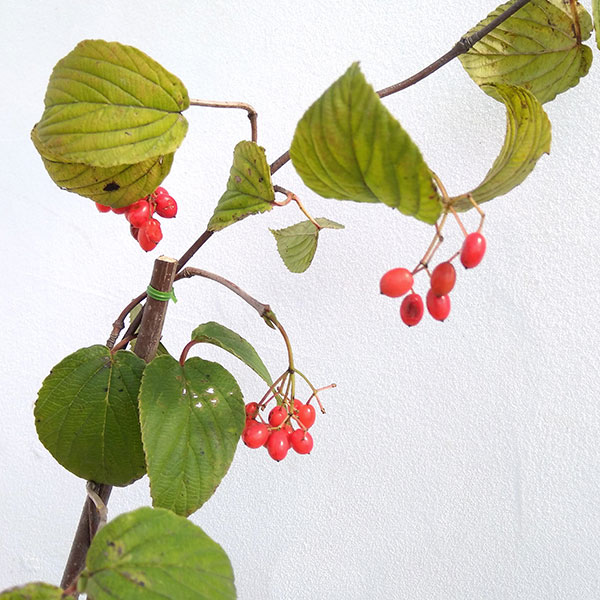 ビバーナム セティゲルム・風鈴ガマズミ花木 庭木の苗/フウリンガマズミ 4-5号ポット風鈴ガマズミは中国原産のガマズミの仲間で、風鈴のように下垂する実の房をつけます。春に白い小花が集まって咲き、秋にゆらゆらとゆれるかわいい赤い実は、ひとつの果実が直径約8mmと他の品種よりも大きいのでよく目立ちます。学名:Viburnum setigerumタイプ:スイカズラ科ガマズミ属の耐寒性落葉低木樹高:0.5〜0.8m花期:5月栽培適地:北海道南部以南栽培方法:性質は強健で栽培は容易です。日向から半陰地に植えてください。土質はほとんど選びませんが、湿潤で腐植質にとんだ肥沃地がよいでしょう。施肥は花後に油粕や水肥を施し、新梢の成長促進と樹勢維持を図ります。小さい株の場合は根元に浸透移行性の薬剤をまくとよいでしょう。お届けする苗は4〜5号(直径12〜15cm)ポット植えです。樹高は変動することがあります。お届け時期により葉がきれいでない状態の場合があります。冬季は落葉の状態となります。写真は成長時のイメージです。※本来は秋に落葉する品種ですが、苗木のうちは葉が少なく、昨今の猛暑の影響もあるため、初夏に葉焼けや斑点がある状態〜落葉した状態となります。お届け時に葉が無い場合があります。フウリンガマズミ 4-5号ポットの栽培ガイド庭木におすすめ!ビバーナムとその仲間