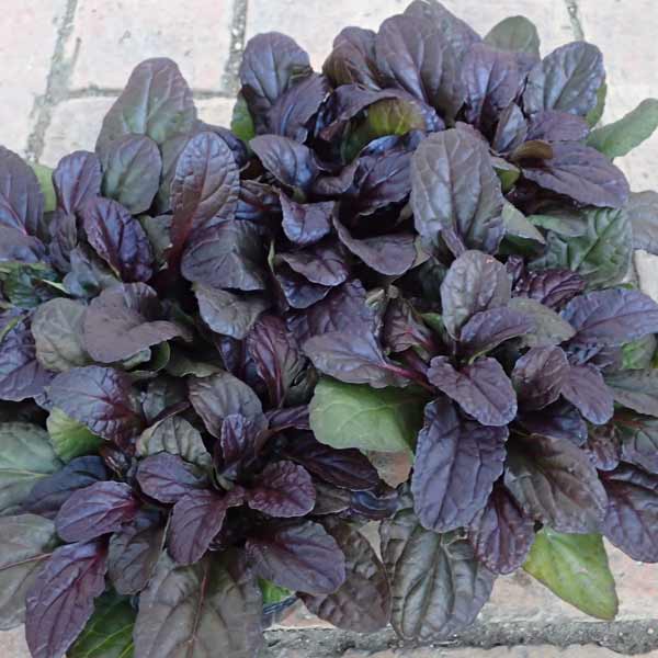 暗緑葉と紫花の対比がシックアジュガ:ダークマホガニー2.5-3号ポット 4株ットダークマホガニーは深く光沢のある葉が特徴のアジュガ。紫の花と葉色のコントラストがアンティークな雰囲気を演出します。アジュガは最もポピュラーなグランドカバー素材のひとつ。常緑で横に広がりながら育ち、日向から半日陰で元気に育ちます。耐寒性も強く、病虫害もないので、一度植えれば手間要らずです。やせた土地でもどんどん増えるのも魅力です。そして、春には地面が覆われるほどたくさん、美しいパープルの花を咲かせます。学名Ajuga reptans 'Dark mahogany'タイプ耐寒性宿根草草丈10〜20cm開花期6〜7月植え付け適期春または秋用途庭植え、花壇、鉢植え、ロックガーデン栽培方法:日向から半日陰に向きます。排水がよく、過湿や乾きすぎにならない場所なら土質は選びません。耐寒性も強く、丈夫に育ち、肥料も不要です。春に株分けで増やして下さい。写真は成長時(開花時)のイメージですが、お届けの際は苗の状態です。