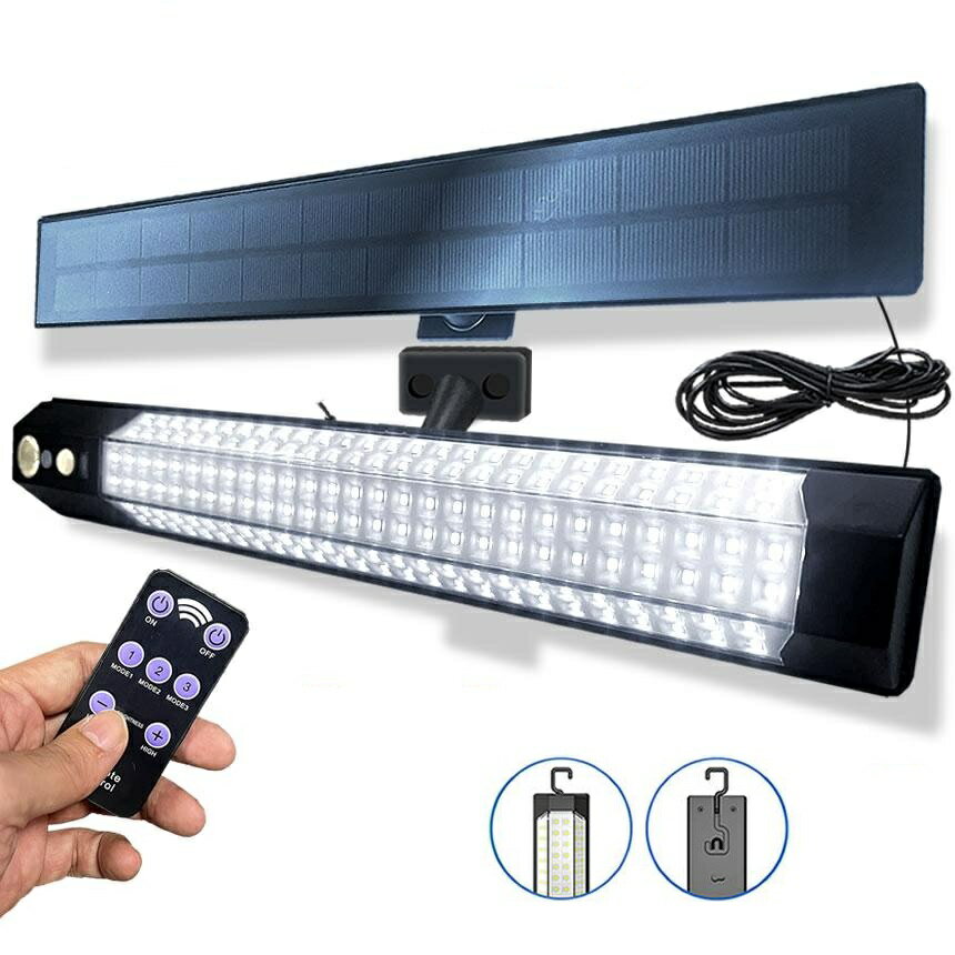 蛍光灯型 LED人感センサーライト 電気代節約 電気代0円 防犯対策 ワンラック上の大型ソーラーパネルを採用。充電性能と点灯時間が、小型のソーラーパネルに比べ大幅にUP 「分離型」セパレートソーラーパネル部分とライト部分が分かれているので、 ソーラーパネルは日当たりのいい場所に設置し、ライトは日の当たらない場所に設置する事が可能。 より充電効率が上がります。 飽きが来ないシンプルなデザイン。見慣れたストレート型のデザインなので、建物のどの場所に設置しても 違和感なく設置が可能。 昼夜センサー内蔵 外の明るさに反応し、消灯します。太陽光で自動的に充電されます。 夕方暗くなると、薄暗い灯りが自動点灯します。リモコンでセンサーモードの切替 /電源ONOFF/明るさの切り替えが可能 人感センサー内蔵 人を感知するとライトが薄暗い色から明るい色に変わります。 スイッチの入り切りが不要なので、勝手口や駐車場の灯りとしてや 防犯ライトとしても効果的。 サイズ:30CM×6cm(LEDライト部分) 防水性能:IP67 電圧:3.7v タイプ:30W 光色:LEDホワイト 満充電時間:晴天時5-6時間 連続点灯時間:最大36時間 天井取付用ブラケット付属(吊り下げ用チェーンは付属しておりません)・リモコン付属 ソーラーパネル部:最大出力6W 電圧6.0Vケーブル長:約3m ※取り扱い説明書は付属しておりません。 ※輸入品の為、初期不良時のみの対応となります