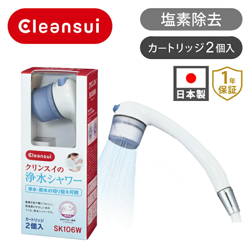 メーカー名:クリンスイ型番:SK106W-GRJANコード:4962752006227●髪にも肌にもうれしい、脱塩素のやさしさ。浄水・原水切り替え付。●用途に合わせて浄水/原水がワンタッチで切り換えできる。●髪にも肌にもやさしい水●毎分8リットル?12リットルの、たっぷりした水量●60度のお湯まで、使える。●ほとんどのシャワーに取り付けられる。【規格概要】サイズ:最大幅56mm*高さ194mm本体重量:210g(満水時250g)ろ材:酸化還元ろ材(亜硫酸カルシウム)処理能力:000リットルカートリッジ交換の目安:2か月(1日60L使用)流量:8リットル?12リットル/分(カートリッジ1コあたり4000リットル、1日に60リットル使用の場合約2か月*2コ)同梱部品:本体1本/カートリッジ2コ/アダプターセット1コ/取扱説明書1部/愛用者カード1枚付属のカートリッジ:SKC205W交換用カートリッジ:SKC205W