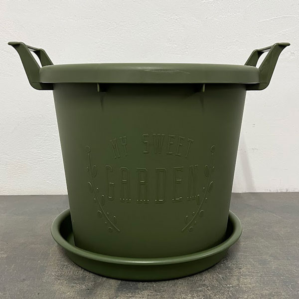 持ち手付きのおしゃれなプラ鉢グロウコンテナ30型(直径30cm)とグロウプレート30型(ダークグリーン)のセット持ち手付きプラスチック鉢です。機能的な取っ手と雑貨風デザインが特徴で、通気性と水はけの良い深型構造が様々な植物の成長をサポートします。グロウプレート(受け皿)は、鉢底からの水漏れを防ぐだけでなく、コンテナの蓋としても利用でき、余った土や資材の収納容器としても活躍します。両者を組み合わせることで、ガーデニングをよりスマートに、多用途に楽しむことができます。セット内容: グロウコンテナ30型(直径30cm)ダークグリーン[持ち手付きのおしゃれなプラ鉢] × 1個グロウプレート30型 ダークグリーン[グロウコンテナ30用の受け皿] × 1個※写真はイメージです。<グロウコンテナ30型(直径30cm)ダークグリーン>雑貨のような遊び心のあるコンテナポット。機能とデザインを兼ね備えた取っ手が使い勝手の良いプラスチック鉢です。マットな質感で置き場所や植物は和風洋風共にマッチします。深さがあるので土がたっぷり入り、水はけと通気性の高い上げ形状は、果樹やバラの植え込みにもオススメです。丈夫で扱いやすい取っ手付きなので持ち運びもラクラク。側面の刻印部分に色を塗ってオリジナルポットとして楽しむこともできます。サイズ:幅35.2cm、奥行30cm、高さ28.7cm(底面の内径:約21.5cm) 土容量:11リットル色:グリーン材質:ポリプロピレン底穴あり <グロウプレート30型 ダークグリーン>グロウコンテナ(プラ鉢)用の受け皿です。この受け皿はグロウコンテナの上に載せてフタとして使うこともでき、グロウコンテナを積み重ねたり、土や肥料などの収納容器として利用することも可能です。サイズ:直径28.5cm、高さ4cm 材質:ポリプロピレン