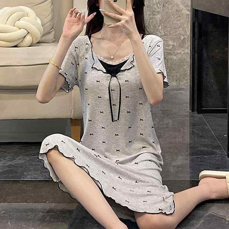 ワンピース レディース 春夏 接触冷感 かわいい ナイトウェア ルームウェア 部屋着 半袖 M L XL XXL 薄手 ゆったり ラウンドネック ドッグ バニー ベア スター コットン
