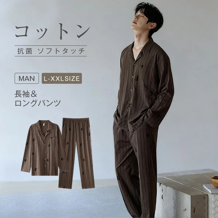 ・カテゴリ: パジャマ・主な素材: 綿100%・柄: ストライプ・スタイル: セットアップ・厚さ: 中程度・織り方: ニット・ネックライン: 襟付き・袖丈: 長袖・パンツ丈: 長ズボン・機能: 伸縮性、保温、快適、リラックス、睡眠、部屋着・性別: メンズ・対象年齢: 40-60代・着用シーン: アウトドア、部屋着・サイズ展開: L, XL, XXL, XXXL