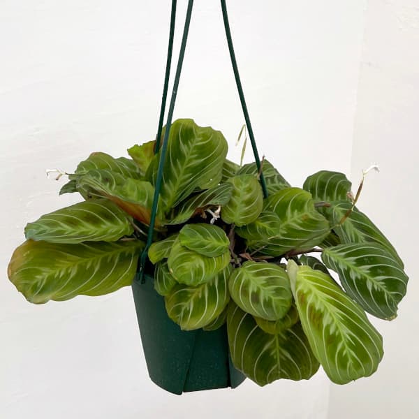 初売りセール 熱帯アメリカ原生の観葉植物 自然の芸術カラーリーフ 武農園観葉植物/マランタ:キャットマスタッシュ 5号吊り鉢★入荷から日数が経ったためセール価格となりました。商品の状態は画像と異なる場合があります。★濃い黒とグリーンの独特な葉模様が特徴的なマランタキャットマスターシュです。マランタは熱帯アメリカ原産の多年草。薄暗い林の中に自生します。刷毛斑と赤い葉脈が美しい葉をもち、茎をのばして成長します。南国の雰囲気満点。暗めの場所でも元気に育ちます。高温多湿を好み、葉から空気中の水分を取り込む植物なので、年間を通してときどき霧吹きで葉に水をかけてください。タイプクズウコン科の非耐寒性多年草原産国熱帯アメリカ日照半日陰(室内向き)耐寒温度10度育て方:室内の明るい窓辺などに吊るしてお楽しみください。春から秋の気温が高い期間は、戸外でも栽培できます。真夏の強い日差しに当てると葉焼けすることがあるので明るい日陰程度の場所を選んでください。水やりのタイミングは、鉢土の表面が乾いてから更に3〜4日後に、底から出るくらいたっぷりと水やりをして下さい。春から秋の生育期間中は、2〜3週間に1回程度、薄めた液肥を与えます。生育しすぎて根詰りを起こすと、根元に近い葉が落ちてきますので、そうなる前に1〜2年に1回植え替えをして下さい。植え付けはお好みの容器に観葉植物用の培養土または赤玉土6、腐葉土2、軽石砂2の割合で配合した土を入れて植えます。冬は室内に取り込み、水やりをごく控えめにしてください。※写真はイメージです。 ■お届け地域につきまして・冬季は寒冷地や配送日数のかかる地域へのお届けができません。(概ね12〜3月、北海道、東北、沖縄、離島など)・但し個別の植物の耐寒温度により、お届け可能であればご相談させていただく場合があります。 マランタ:キャットマスタッシュ 5号吊り鉢の栽培ガイド観葉植物の管理方法