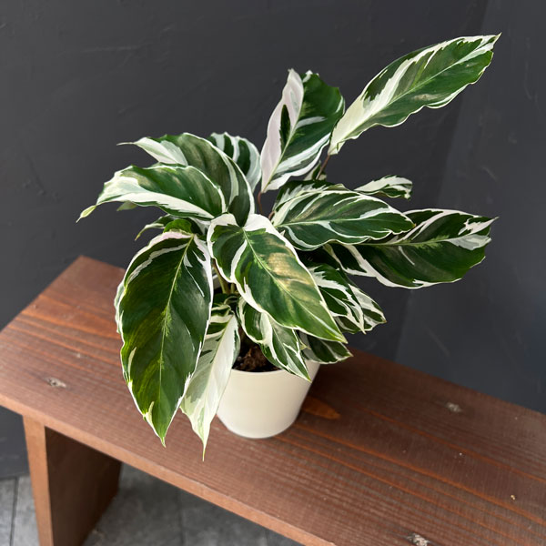 美しいカラーリーフの観葉植物観葉植物/カラテア:ホワイトフュージョン 4号入り★とても繊細な植物です。特性を理解していただいた上でご購入下さい 若干葉傷みある葉がございますが、植物のためそのまま残して出荷いたします★美しいカラテアホワイトフュージョンが入荷しました。カラテアロウサイエの変異種で、美しい白斑が特徴です。ですが、この白斑が非常に繊細です。個体差や、若干の傷みがある場合がございます。また、育てていると先祖がえりする場合がありおます。カラテアは熱帯アメリカや熱帯アフリカに分布するクズウコン科の植物で、その仲間は100種類以上の品種があります。※斑の入り方には個体差があります。学名Calathea 'White Fusion' タイプクズウコン科の常緑多年生草本耐寒温度10℃以上日照半日陰育て方:空中湿度の高い場所を好み、直射日光を嫌います。乾燥したり、日光が強すぎると葉が丸まったり、光沢がなくなったりします。また、ハダニやカイガラムシが発生し易い傾向がありますので、葉水を与えて、ハダニを防ぎ、カイガラムシは見付け次第かき落としてください。※写真はイメージです。斑の入り方は個体差があります。繊細なため輸送で若干葉が傷む場合があります。 ■お届け地域につきまして・冬季は寒冷地や配送日数のかかる地域へのお届けができません。(概ね12〜3月、北海道、東北、沖縄、離島など)・但し個別の植物の耐寒温度により、お届け可能であればご相談させていただく場合があります。 カラテア:ホワイトフュージョン 4号入りの栽培ガイド観葉植物の管理方法