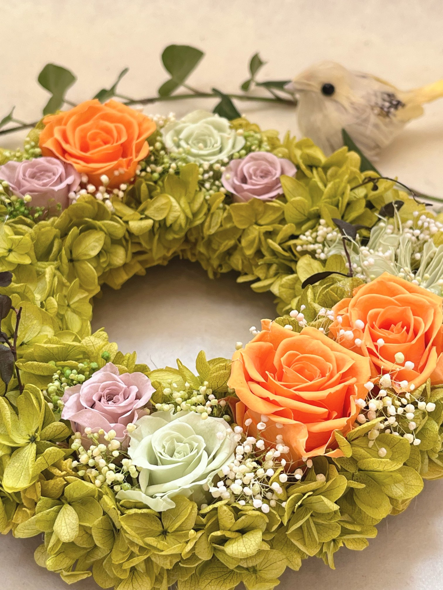 渋めオレンジ色とバラが若草色の紫陽花が、元気と癒しの両方をお楽しみいただけるリースです。 お誕生日や結婚祝い、母の日、敬老の日など、さまざまなお祝いのシーンにぴったりのギフトです。色とりどりの緑が織りなす美しいデザインは、見る人の心を和ませ、特別な空間を演出します。退職や卒業のお祝いにも最適で、贈る相手に喜ばれること間違いなしです! 使用花材:プリザーブドフラワー( バラ かすみ草 アジサイ) サイズ: 直系18センチ プリザーブドフラワーですので水をかけないで下さい。 ※撮影用小物は含まれていません。 木製アレンジスタンドはこちらからご注文下さい。