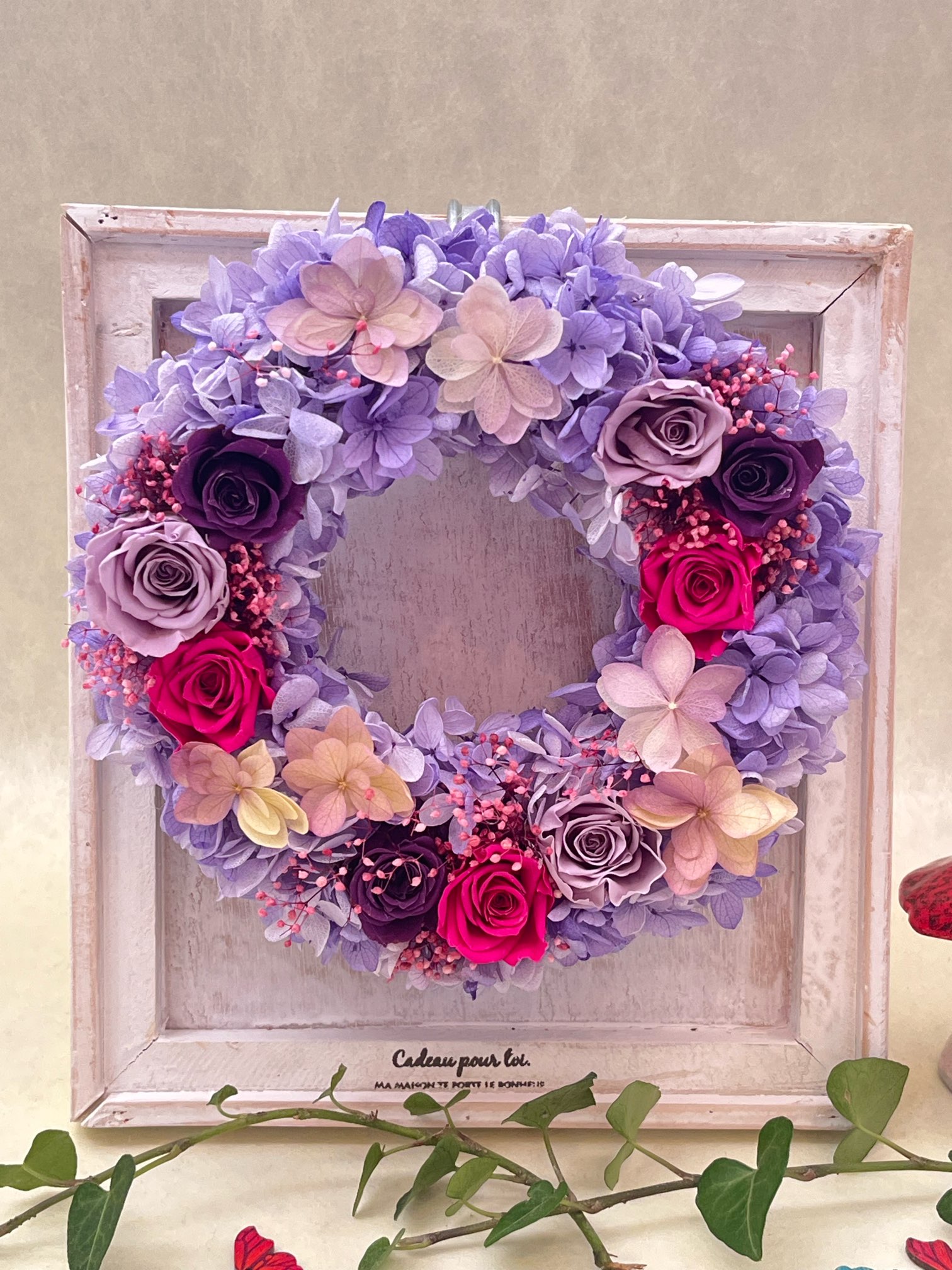 紫とピンクの幻想的な色合いが魅力のプリザーブドフラワーリースです。 お誕生日や結婚祝い、母の日や敬老の日など、特別な日のギフトにぴったり。お部屋に飾るだけで、華やかで心温まる雰囲気を演出します。大切な人への贈り物に、このファンタジーリースで笑顔を届けてみませんか? リーススタンドで飾ったり、ワイヤースタンドにぶら下げたり、お好きなスタイルで飾ってお楽しみ下さい。 リーススタンドやワイヤースタンドに飾るとお洒落感アップします。 使用花材:プリザーブドフラワー(バラ かすみ草 アジサイ ) サイズ: 直系17センチ プリザーブドフラワーですので水をかけないで下さい。