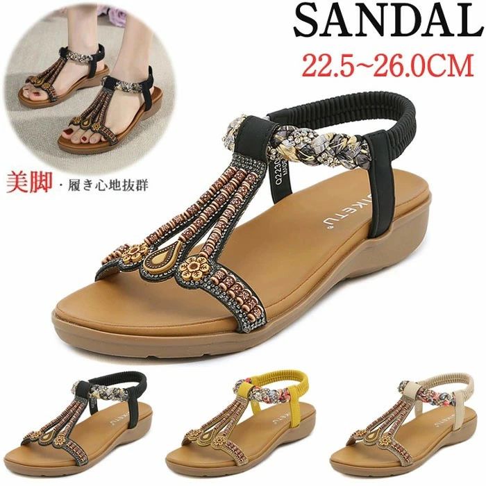 商品詳細 【オシャレのデザイン】 おしゃれなボヘミアン調のビーチサンダル。 きらきらビジューで綺麗な足元を演出します。 履き口がゴムだから脱げ防止にも活躍。 【柔軟性が抜群】 TPRソールには耐久性の高いゴムソールを採用し、クッション性や柔軟性に優れており、足が痛くならない&疲れ知らずのらくちんな履き心地! 【安心の安定感】 かかとありサンダルなので、脱げる心配もありません。 柔らかいクッションがあり、ローヒールだから、歩きやすい楽チンな履き心地。 【軽い履き心地】 軽量だから持ち運びも楽々♪お盆の帰省や夏休みの海外旅行に持って行くのにも便利な軽さです。 ストレスフリーで一日中履いていられる、足が痛くなりにくい&疲れないぺたんこグラディエーターです。 【夏の定番アイテム】 デニムやスキニーパンツ、スカートにも合わせやすく、デイリー使いからお出かけスタイルにも活躍してくれ重宝します。 南国リゾートの雰囲気が漂う、夏の足元に欠かせない、 オシャレなビジューぺたんこサンダルです! サイズ 35(内寸22.5cm) 36(内寸23cm) 37(内寸23.5cm) 38(内寸24cm) 39(内寸24.5cm) 40(内寸25cm) 41(内寸25.5cm) 42(内寸26cm) カラー ブラック、ベージュ、イエロー 素材 PU+ゴム ヒール 約3cm 注意事項 ※すべて平置きサイズ、計測につきましては手測りとなりますので 若干の誤差はご了承ください。 ※お客様のモニター環境により実物の色合いと若干お色目が異なる場合がございます。 ※本靴の26.0cm=ビジネスシューズの26.0cm=スポーツショーズの26.5cm(個人差が異なる場合がございます。ご参考お願い致します。)