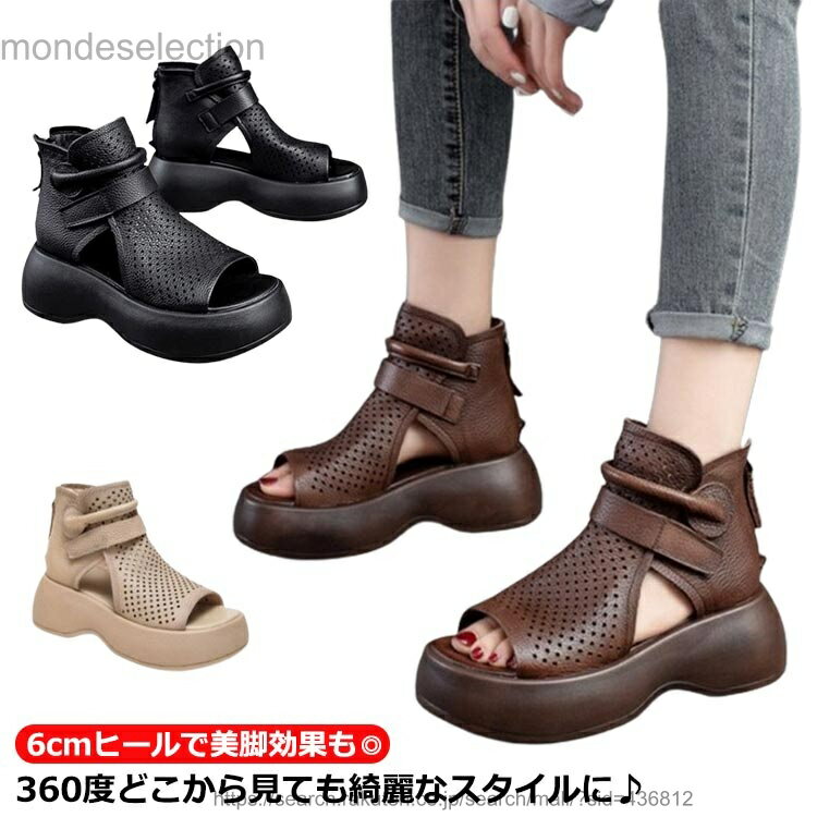 360度どこから見ても綺麗なスタイルに♪オープントゥ厚底ブーツサンダル。アッパーにはパンチングデザインで、通気性があります。シンプルながらも大人の抜け感を演出してくれるデザインで、女性らしさと上品な印象を与えてくれる1足。指の付け根が見えるか見えないかくらいの甲浅なので、華奢に見えて女性らしいです。バックにジッパー付だから、編み上げブーツ特有の脱ぎ履きの面倒がなく、脱ぎ履きしやすい。安定感のある厚底サンダル。パンツにもスカートにも合わせやすいシンプルデザイン。ヒールが苦手な方にも履きやすい。 サイズ 22.5cm 23cm 23.5cm 24cm 24.5cm 25cm 25.5cm 26cm 26.5cm サイズについての説明 ヒール約6cm 筒丈約10cm 素材 pu 合成ゴム 色 ブラック ベージュ ブラウン 備考 ●サイズ詳細等の測り方はスタッフ間で統一、徹底はしておりますが、実寸は商品によって若干の誤差(1cm〜3cm )がある場合がございますので、予めご了承ください。 ●商品の色は、撮影時の光や、お客様のモニターの色具合などにより、実際の商品と異なる場合がございます。あらかじめ、ご了承ください。 ●製品によっては、生地の特性上、洗濯時に縮む場合がございますので洗濯時はご注意下さいませ。 ▼色味の強い製品によっては他の衣類などに色移りする場合もございますので、速やかに(脱水、乾燥等)するようにお願いいたします。 ▼生地によっては摩擦や汗、雨などで濡れた時は、他の製品に移染する恐れがございますので、着用の際はご注意下さい。 ▼生地の特性上、やや匂いが強く感じられるものもございます。数日のご使用や陰干しなどで気になる匂いはほとんど感じられなくなります。
